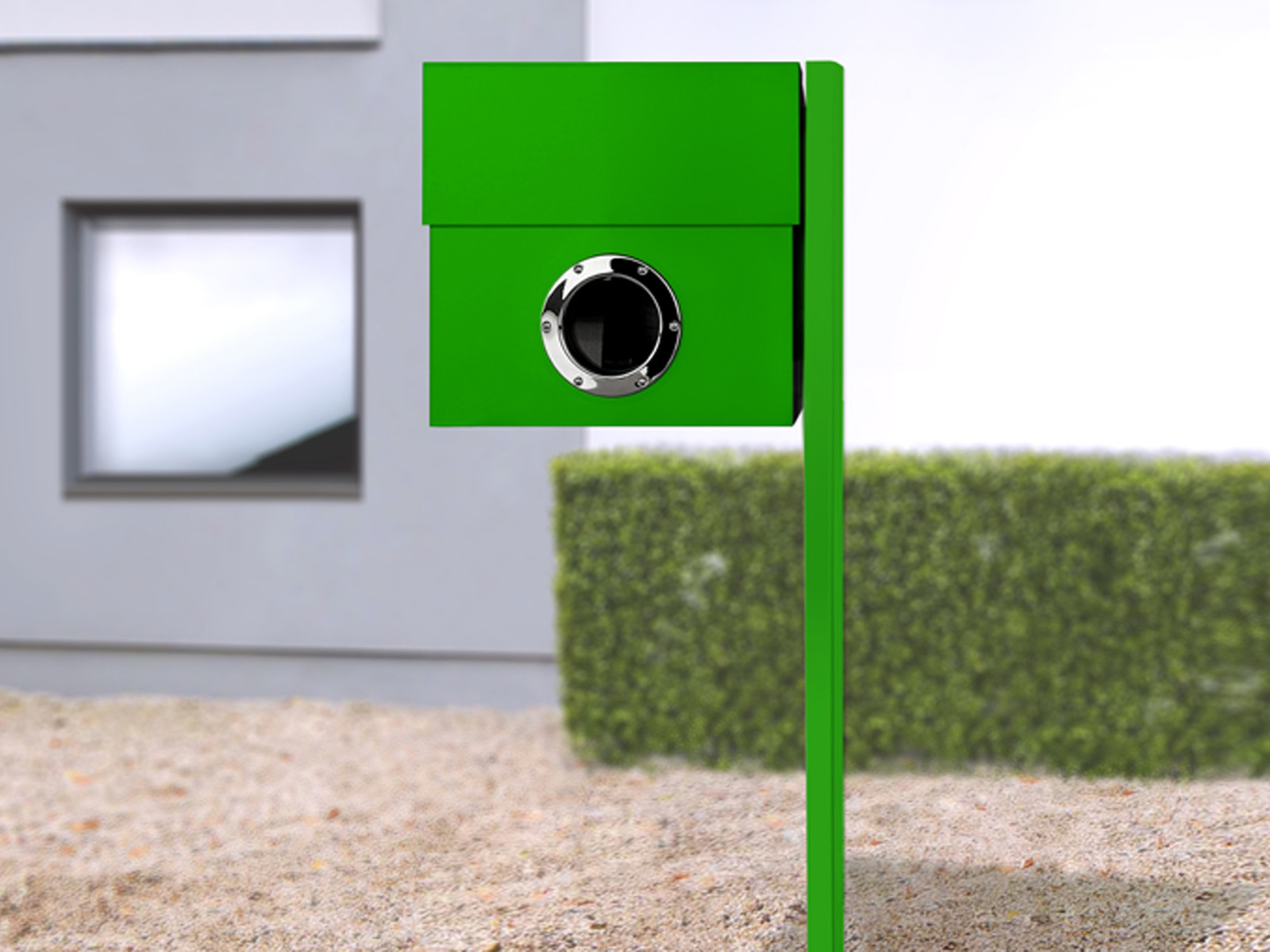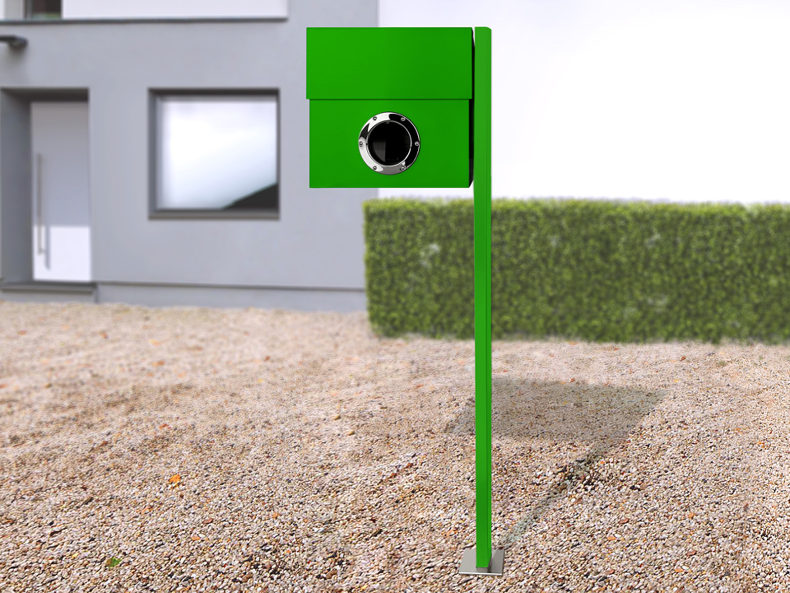 Elegancka i oryginalna stojąca metalowa skrzynka na listy XXL z efektownym okrągłym okienkiem oraz wewnętrznym gazetownikiem.