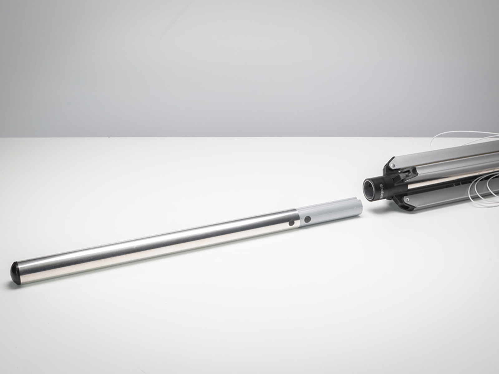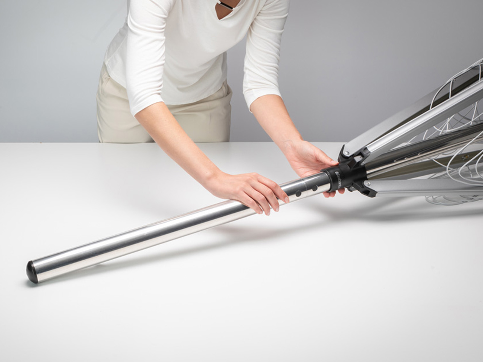 Po wyjęciu z tulei i złożeniu suszarka zajmuje bardzo niewiele miejsca, wytrzymały zaczep umożliwia przechowywanie jej w pozycji wiszącej.