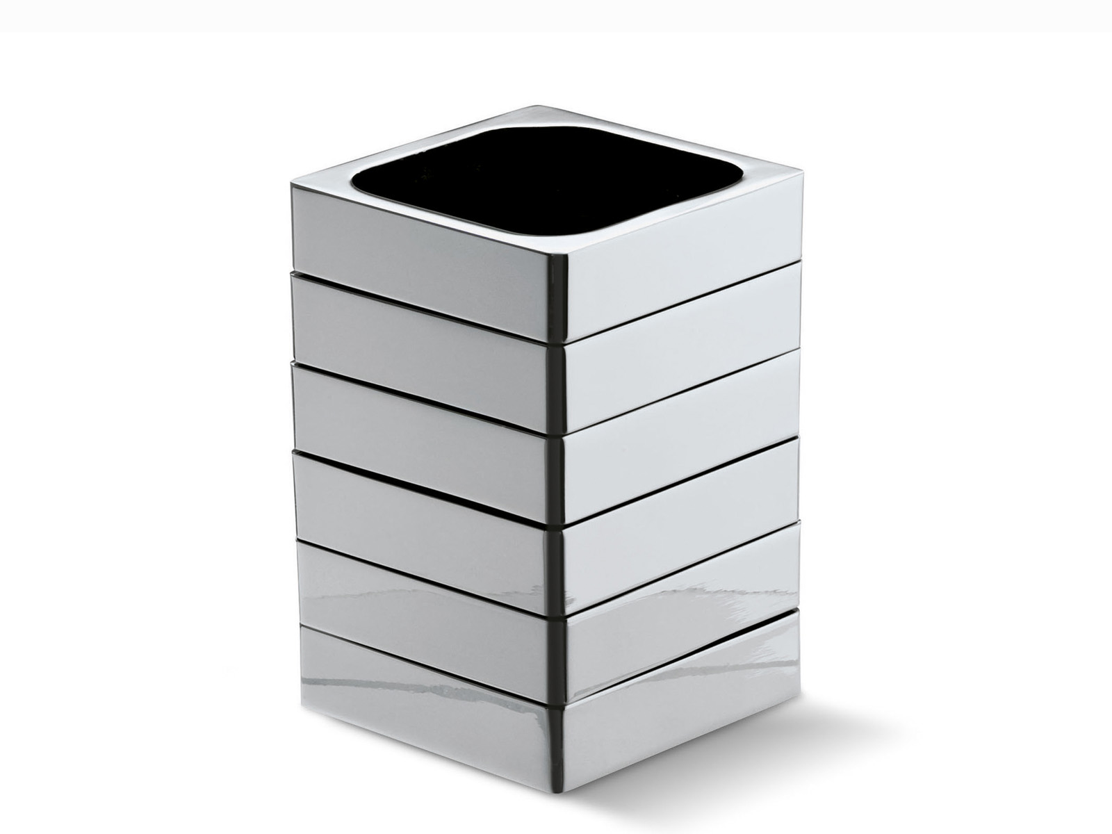 Pojemnik o zmiennym kształcie o specjalnej ruchomej, segmentowej, obracającej się wokół własnej osi konstrukcji, wykonanej z metalu polerowanego na wysoki połysk.