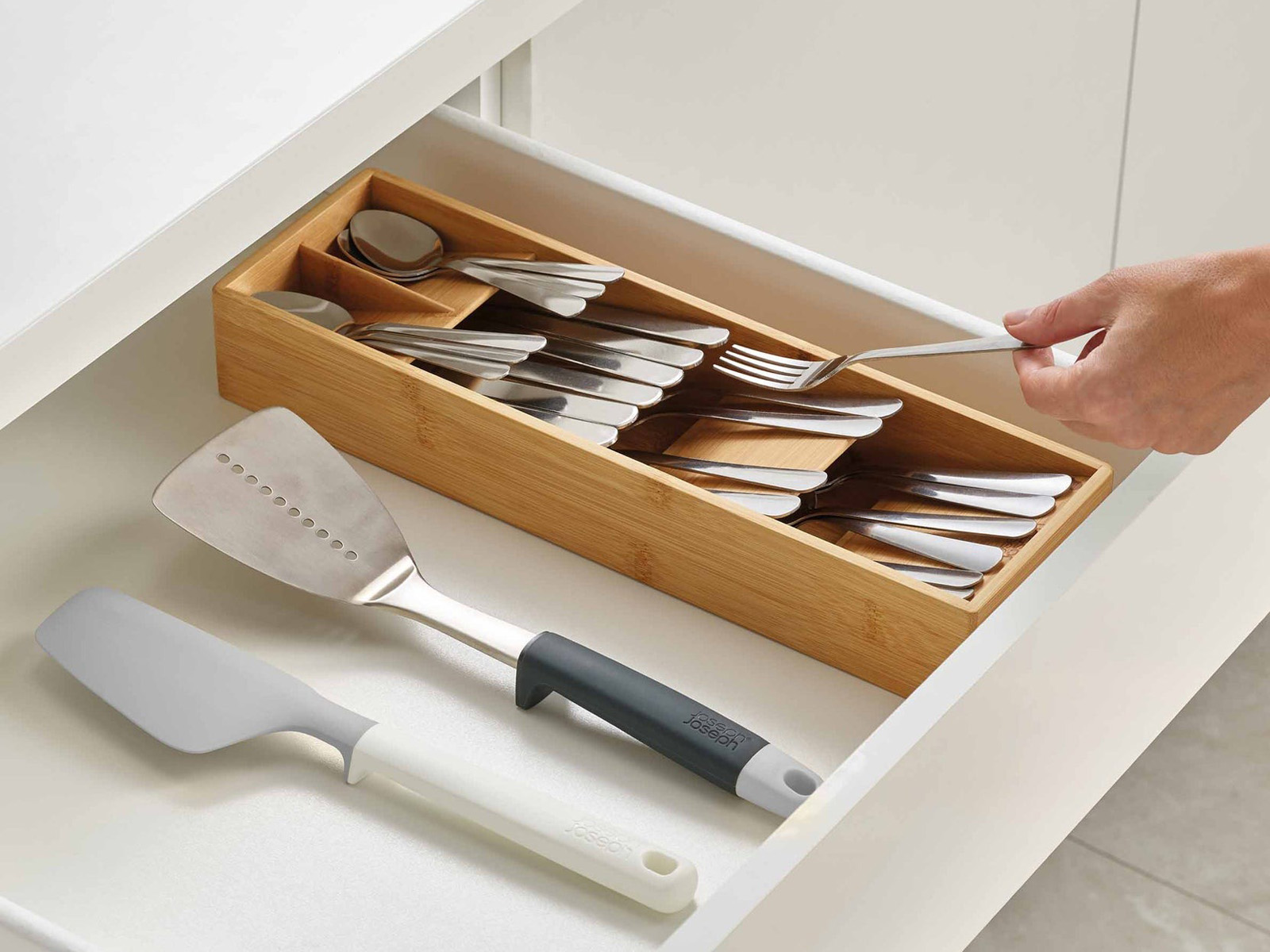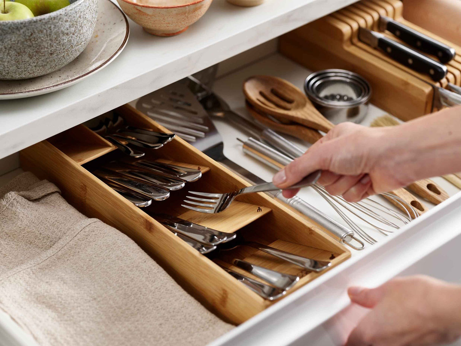Elegancki i praktyczny kuchenny wąski organizer wkład do szuflady do przechowywania sztućców.