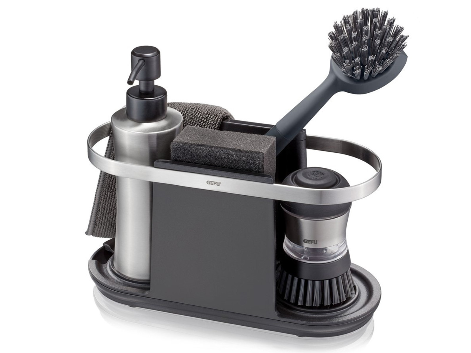 Organizer GEFU Smartline to funkcjonalne akcesorium, które uporządkuje przestrzeń przy zlewie i ułatwi codzienne sprzątanie. Przemyślana konstrukcja pozwala na wygodne przechowywanie gąbek, szczotek, ściereczek oraz dozownika płynu do mycia naczyń w jednym miejscu. Wykonany z wysokiej jakości stali nierdzewnej i tworzywa sztucznego zapewnia trwałość i estetyczny wygląd. Zdejmowana tacka ociekowa umożliwia łatwe utrzymanie higieny, a antypoślizgowe nóżki gwarantują stabilność podczas użytkowania. Możliwość mycia w zmywarce dodatkowo upraszcza pielęgnację organizera.