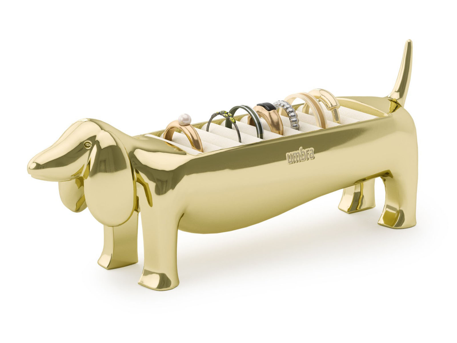 Organizer w kształcie psa jamnika posiada 9 aksamitnych przegródek szczelinowych na pierścionki oraz kolczyki A dziesiąty pierścionek