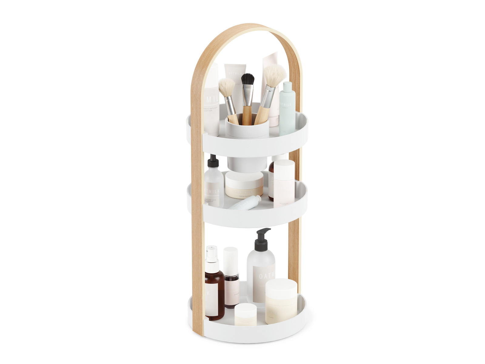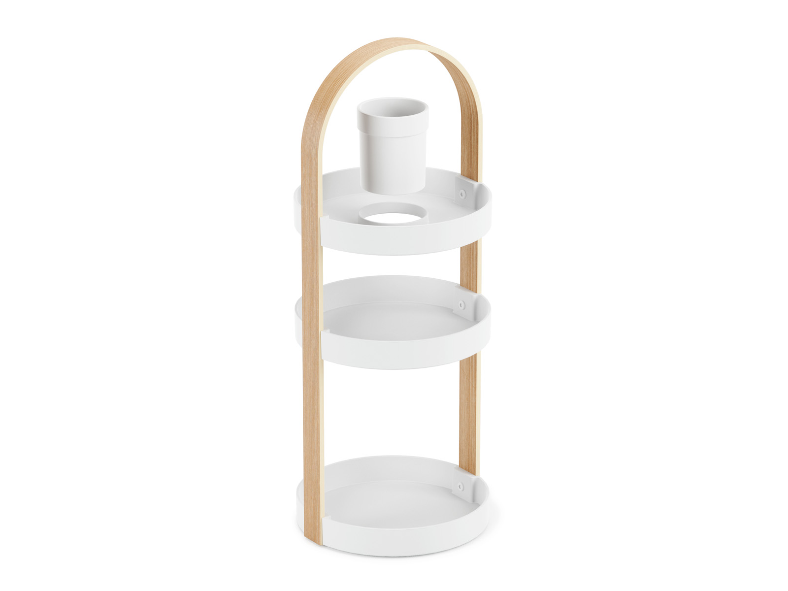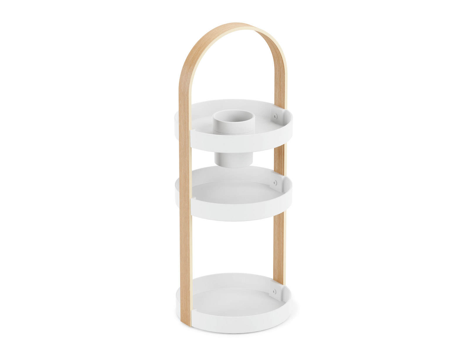 Elegancki nablatowy organizer z 3-ema okrągłymi półkami oraz łączącym je drewnianym giętym uchwytem w kolorze naturalnego drewna.