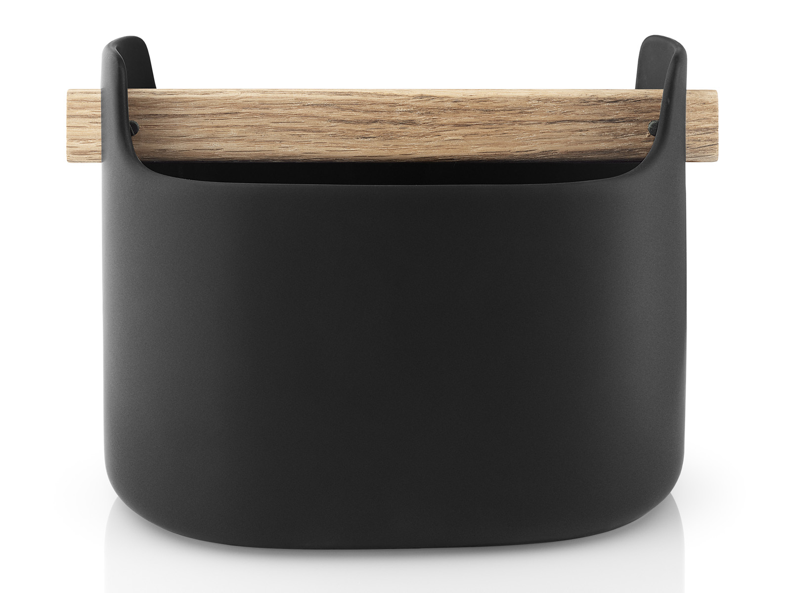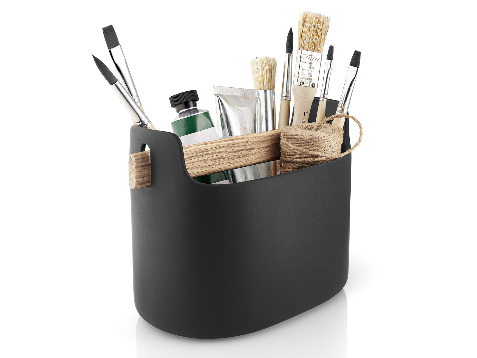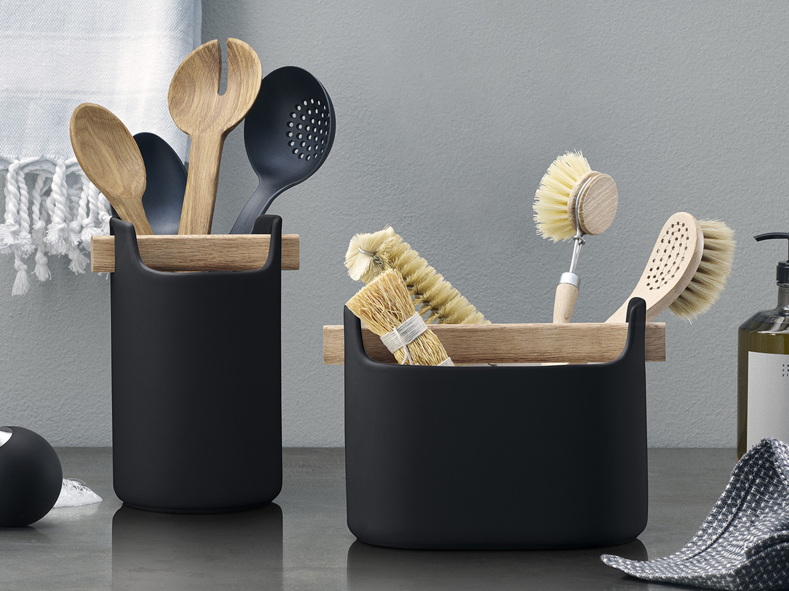 Organizer o owalnym kształcie wykonany z ceramiki, posiada drewnianą rączkę, która służy również jako przegroda do uporządkowania np. przyborów kuchennych czy przyborów do pisania.