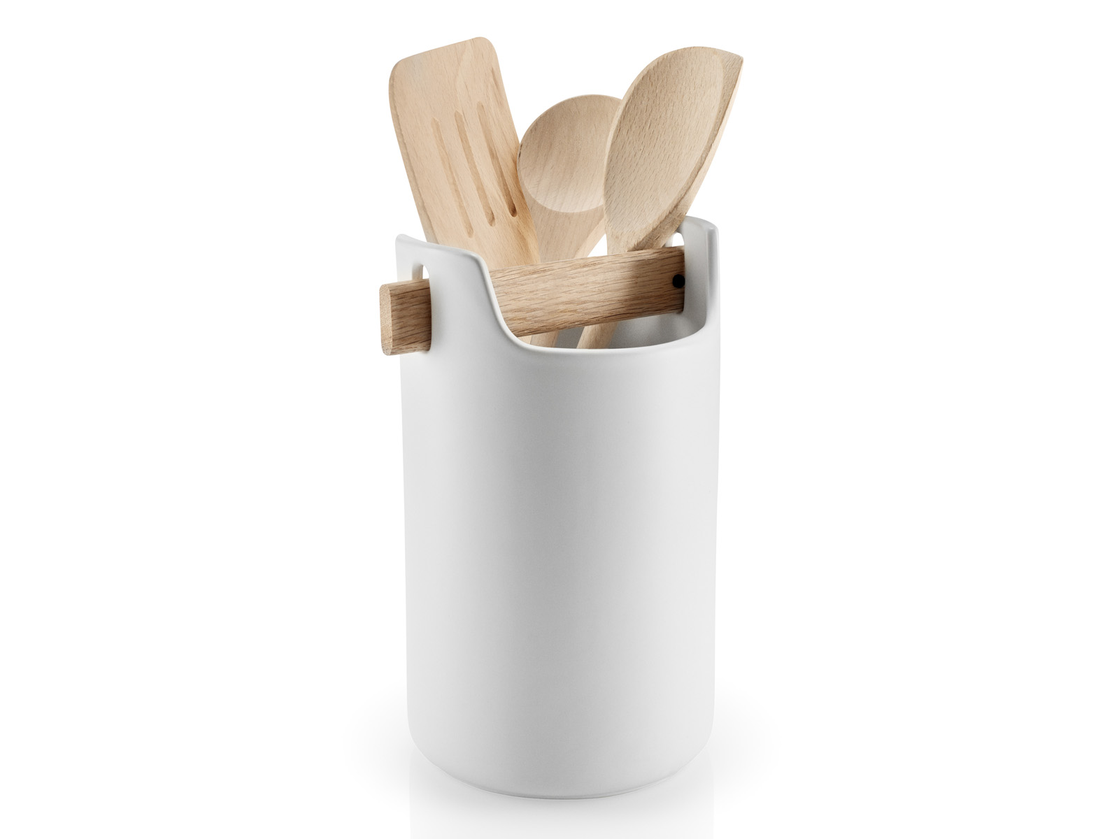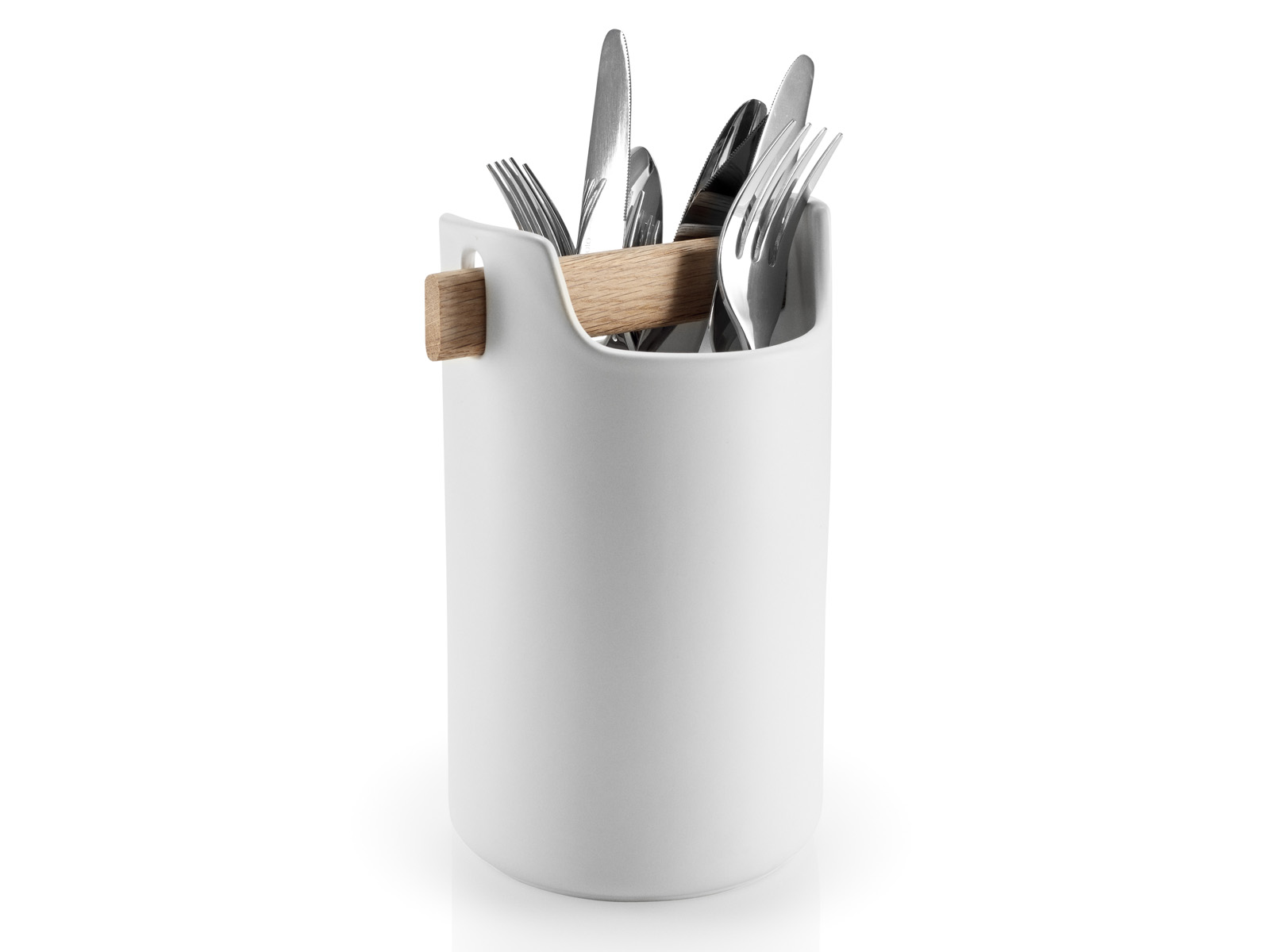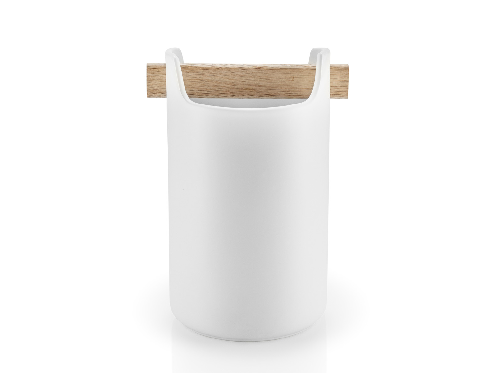 Organizer o cylindrycznym kształcie wykonany z ceramiki, posiada drewnianą rączkę, która służy również jako przegroda do uporządkowania np. przyborów kuchennych czy przyborów do pisania.
