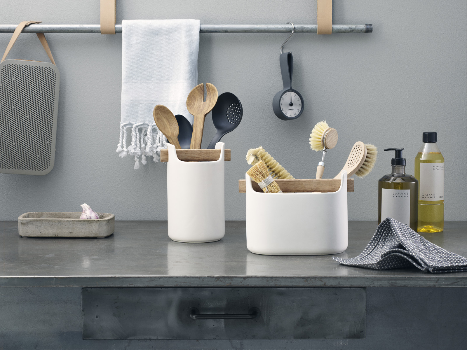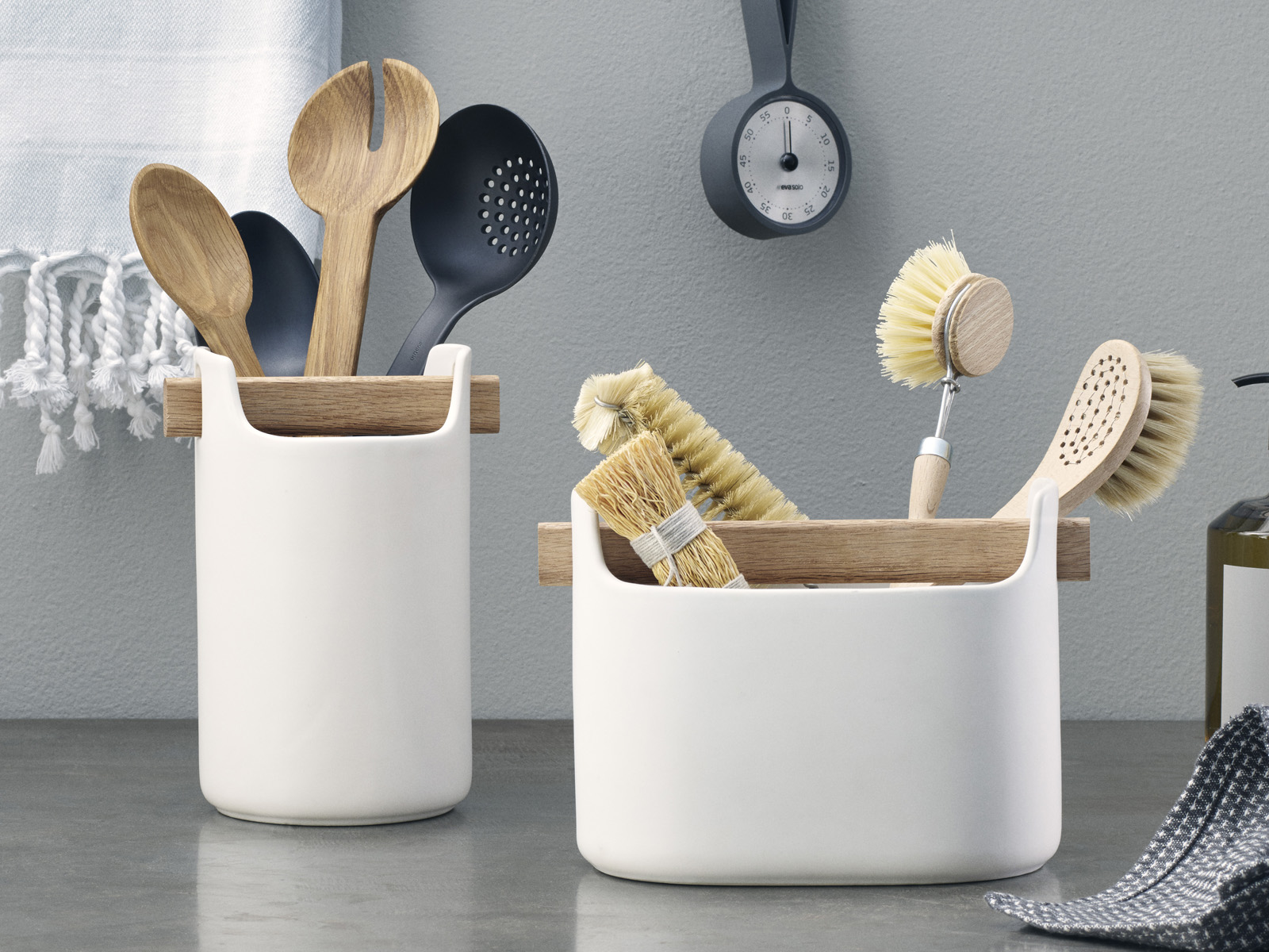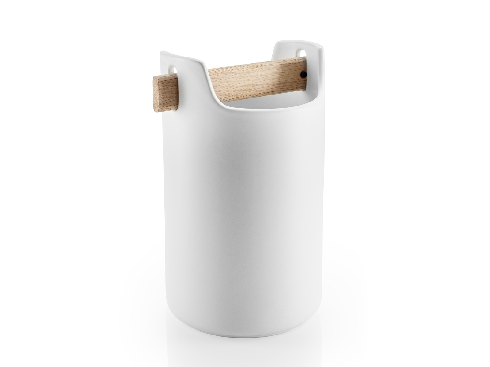 Organizer o cylindrycznym kształcie wykonany z ceramiki, posiada drewnianą rączkę, która służy również jako przegroda do uporządkowania np. przyborów kuchennych czy przyborów do pisania.