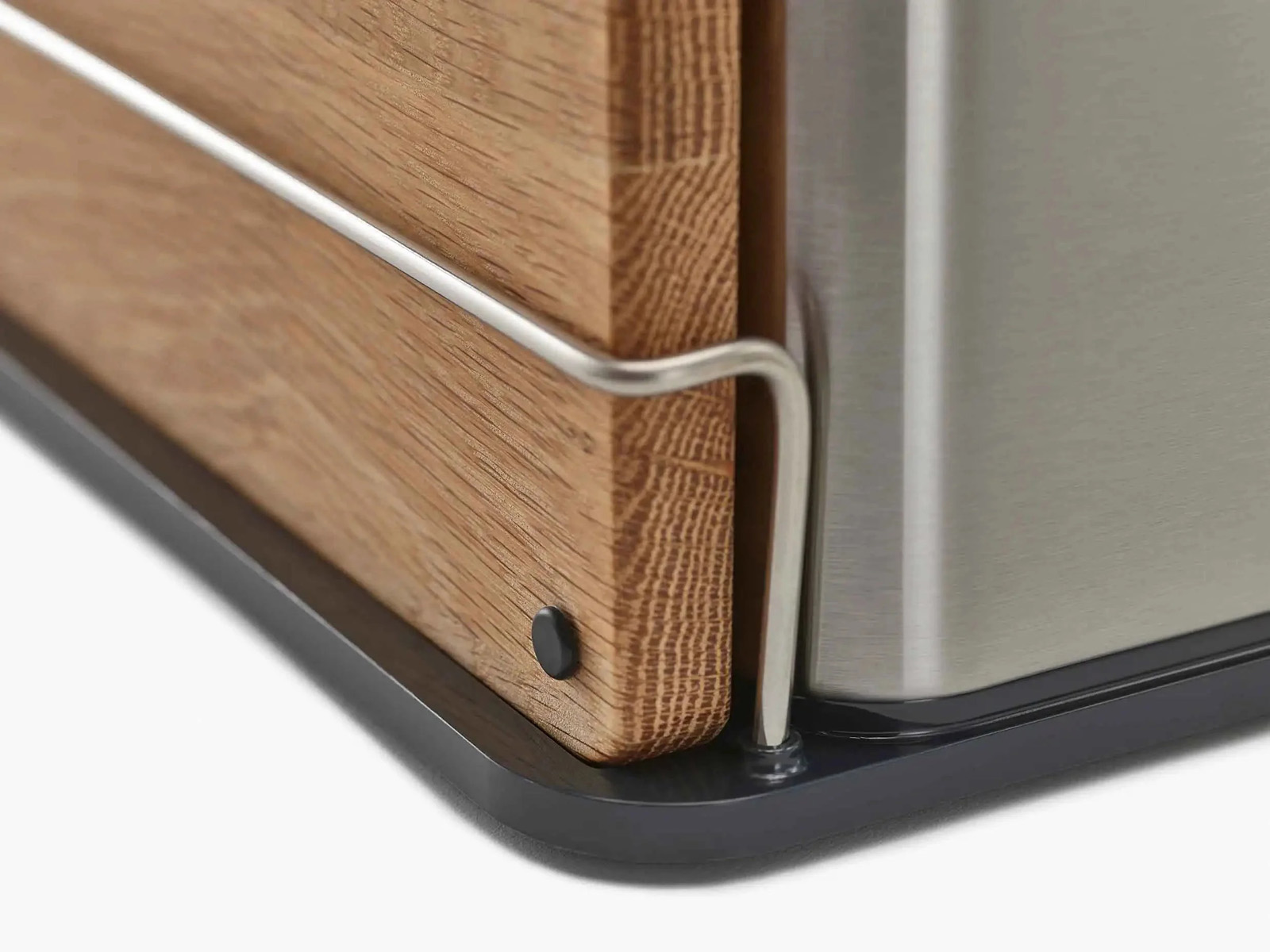 Organizer w komplecie z prostokątną deską do krojenia wykonaną z drewna dębowego, która umieszczona jest w specjalnym uchwycie za pojemnikami organizera.