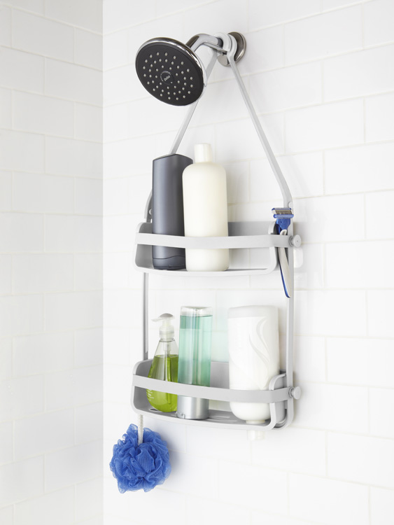 Praktyczny i elegancki dwupoziomowy organizer na kosmetyki i przybory kąpielowe pod prysznic wykonany z tworzywa sztucznego i gumy. Dzięki 2-um giętkim ramionom z haczykami organizer może być mocowany w dwojaki sposób tj. jednopunktowo lub dwupunktowo np. na drążku prysznica lub na kabinie prysznicowej.