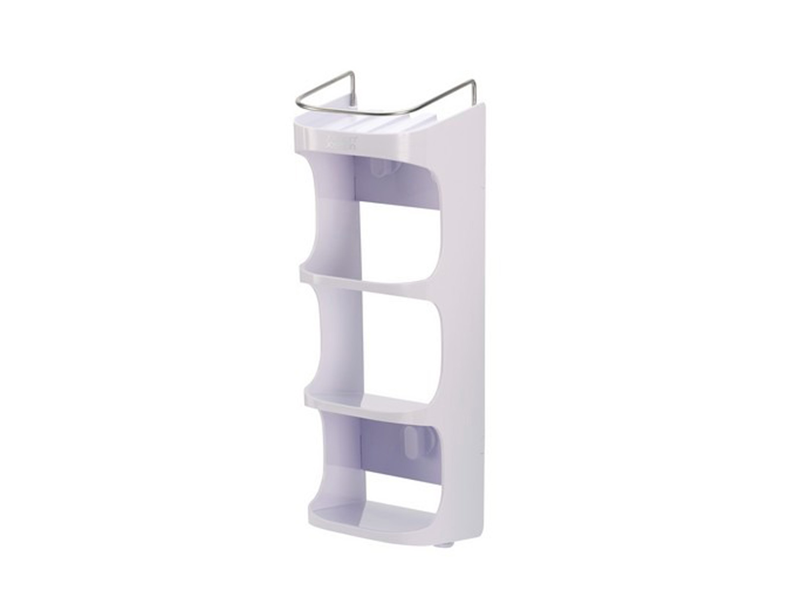 Organizer wykonany z tworzywa sztucznego przeznaczony do przechowywania kosmetyków i przyborów do mycia, posiada 4 samoodpływowe półkami oraz 2 haczyki do zawieszania maszynek do golenia i gąbek.