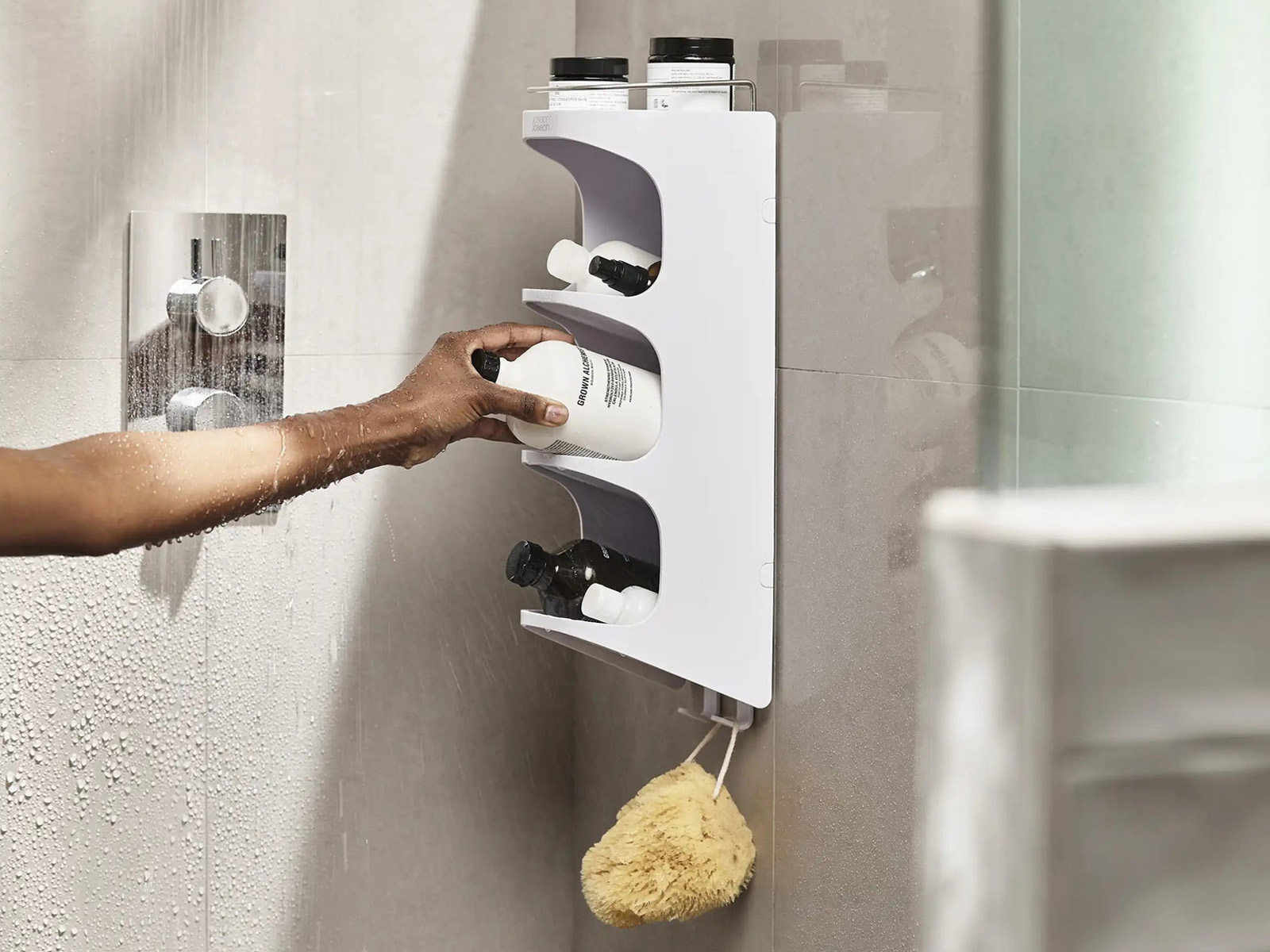 Elegancki i praktyczny ścienny organizer pod prysznic o smukłej konstrukcji do bezinwazyjnego montażu za pomocą przyssawek.