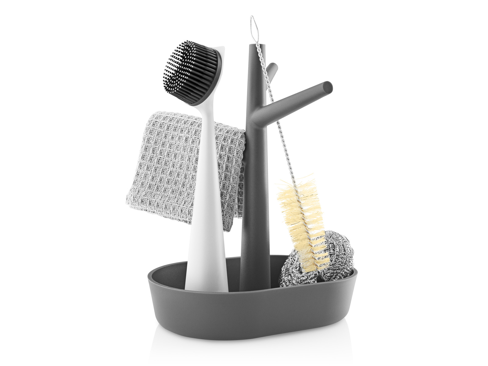 Po środku tacki umieszczony jest rozgałęziony słupek do suszenia ściereczek, myjki i szczotki do mycia naczyń.