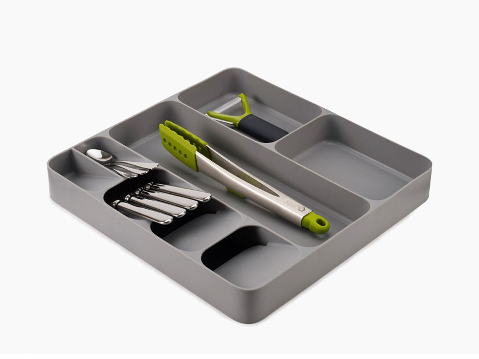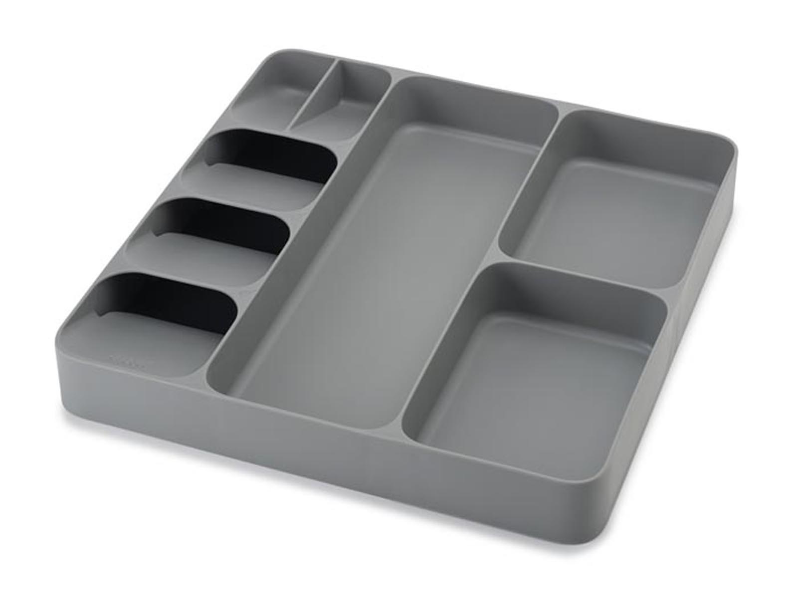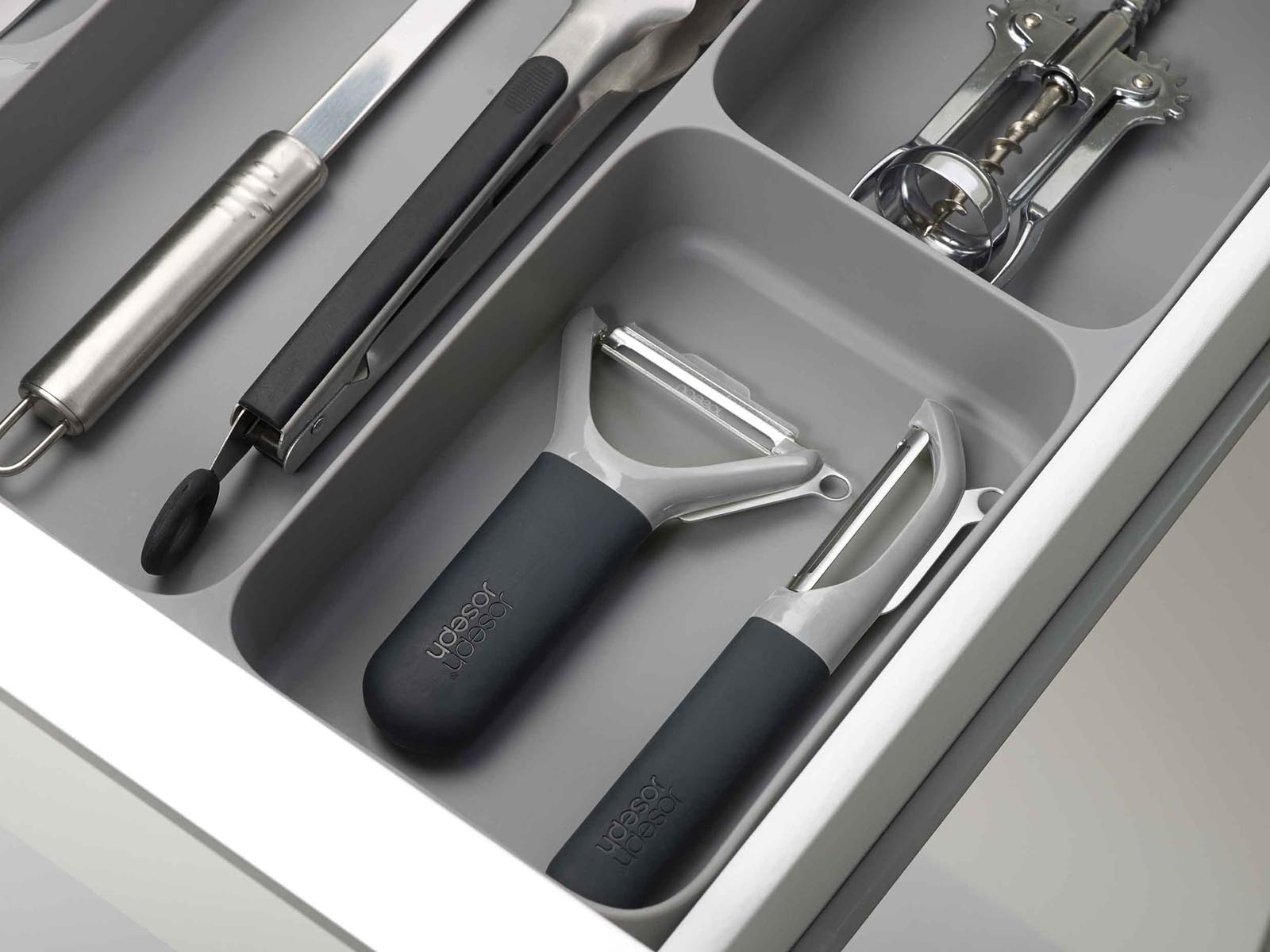 Organizer wykonany z tworzywa sztucznego wolnego od BPA z 3-ema dużymi przegródkami na większe przybory kuchenne oraz ze specjalnie zaprojektowanymi ułożonymi pod kątem 5-oma przegródkami na sztućce.