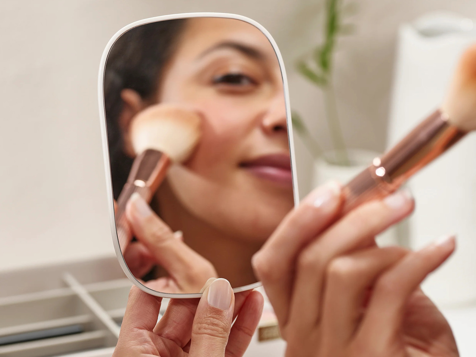 Lusterko w prostokątnym kształcie o zaokrąglonych rogach, dwustronne - z jednej strony lusterko z widokiem 1:1 z drugiej małe lusterko z powiększeniem 3x zapewniającym dokładniejszy szczegółowy widok, idealne do malowania oczu lub brwi - lusterko może być przechowywane na górnym poziomie organizera.
