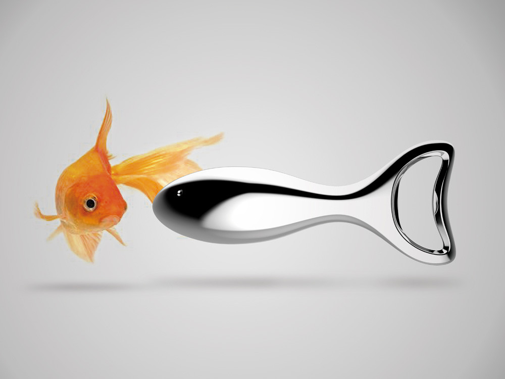 Elegancki i zabawny metalowy stołowy otwieracz do butelek inspirowany kształtem złotej rybki symbolizującej szczęście, witalność i siłę.