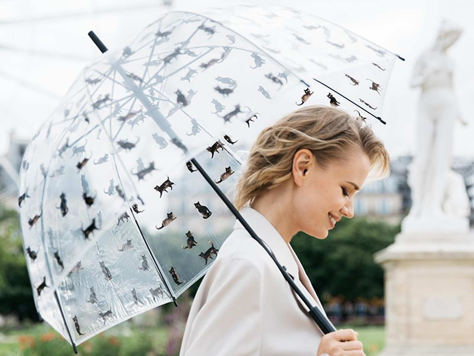 Klasyczny kształt kopuły znakomicie zabezpiecza plecy przed wiatrem i deszczem, a przy tym wspaniale wygląda, będąc stylowym retro dodatkiem. Mimo swojej głębokości, parasol nie ogranicza widoczności, dzięki przezroczystej folii. Parasol posiada zakrzywioną rączkę, nad którą znajduje się przycisk automatycznego rozkładania