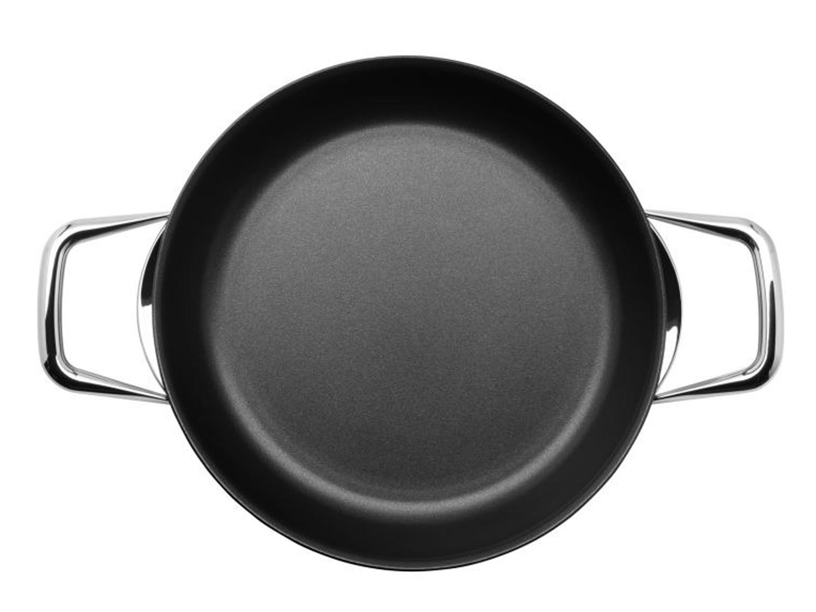 Na bokach patelnia posiada 2 solidne redukujące ciepło uchwyty wykonane ze stali nierdzewnej - puste konstrukcje uchwytów nagrzewają się znacznie mniej niż konwencjonalne, zmniejszając przenoszenie ciepła z naczynia do uchwytu (nie dotyczy używania w piekarniku!).