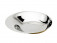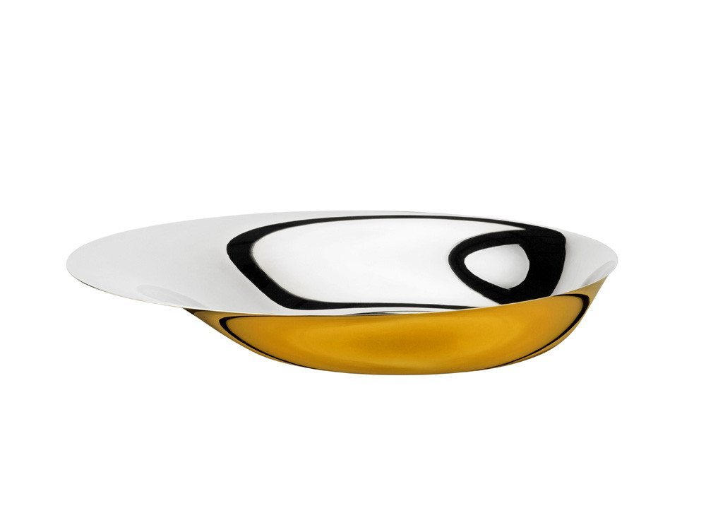 Patera o lekko nieregularnej profilowanej powierzchni wykonana z polerowanej stali nierdzewnej z zewnętrznymi ściankami w kolorze złotym.