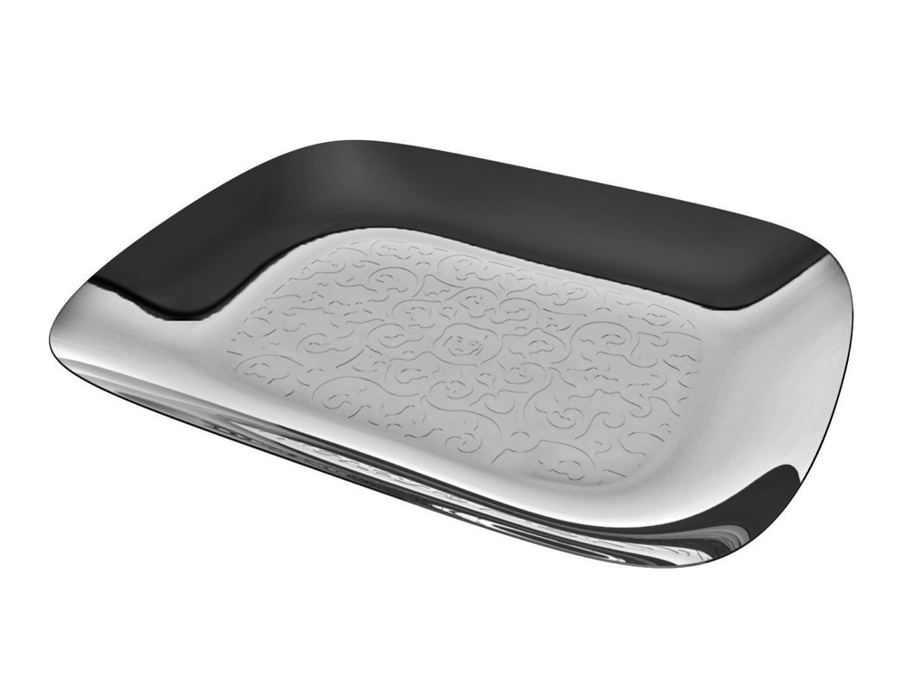 Oryginalna metalowa prostokątna patera/ taca do serwowania z piękną reliefową powierzchnią z ozdobnym bogatym wzorem oraz gładkim szerokim łagodnie wznoszącym się brzegiem. Taca wykonana z wysokiej jakości odpornej na działanie kwasów oraz zarysowania wysokopolerowanej stali nierdzewnej 18/10 o lekko strukturalnej lustrzanej powierzchni.