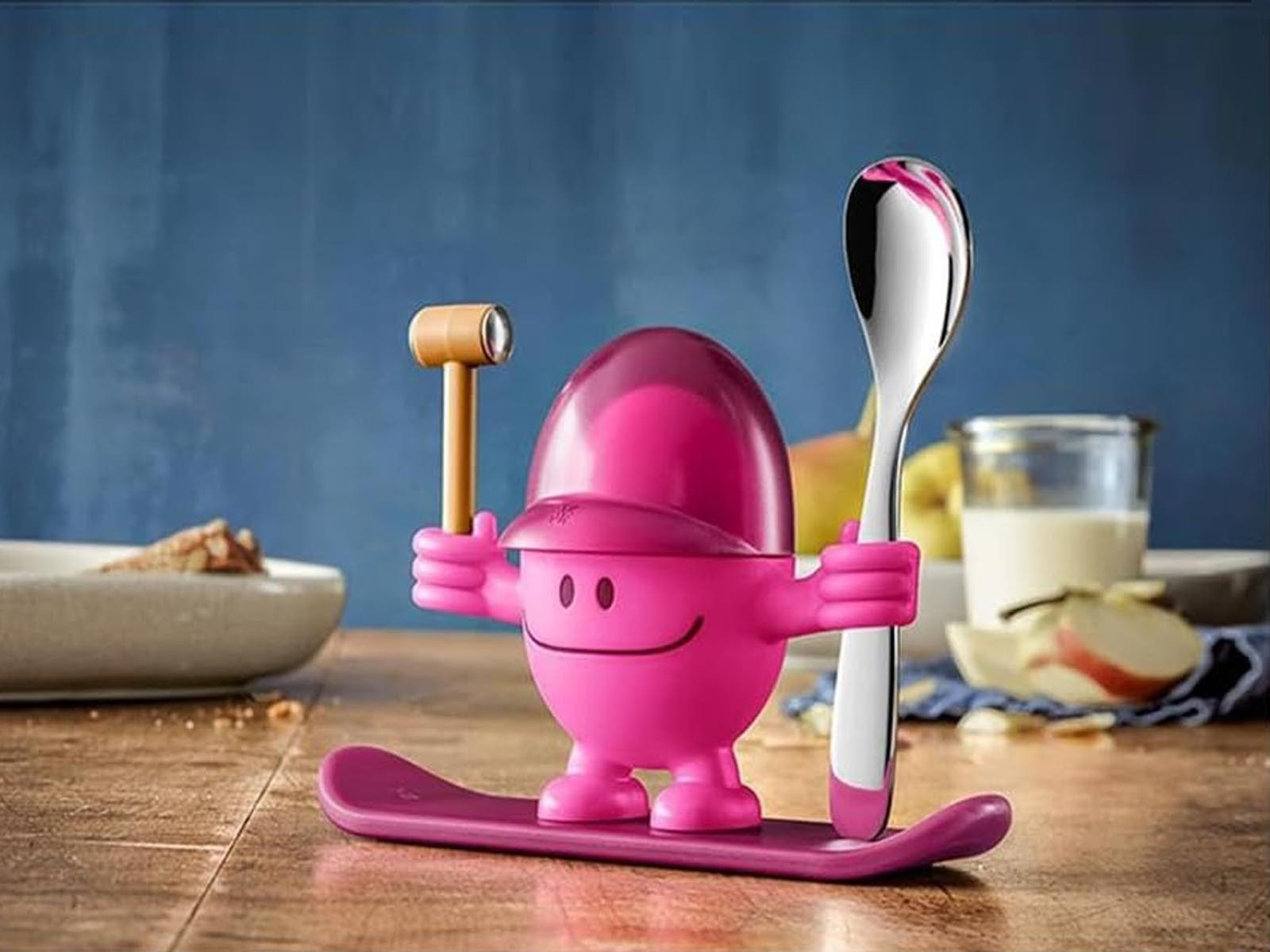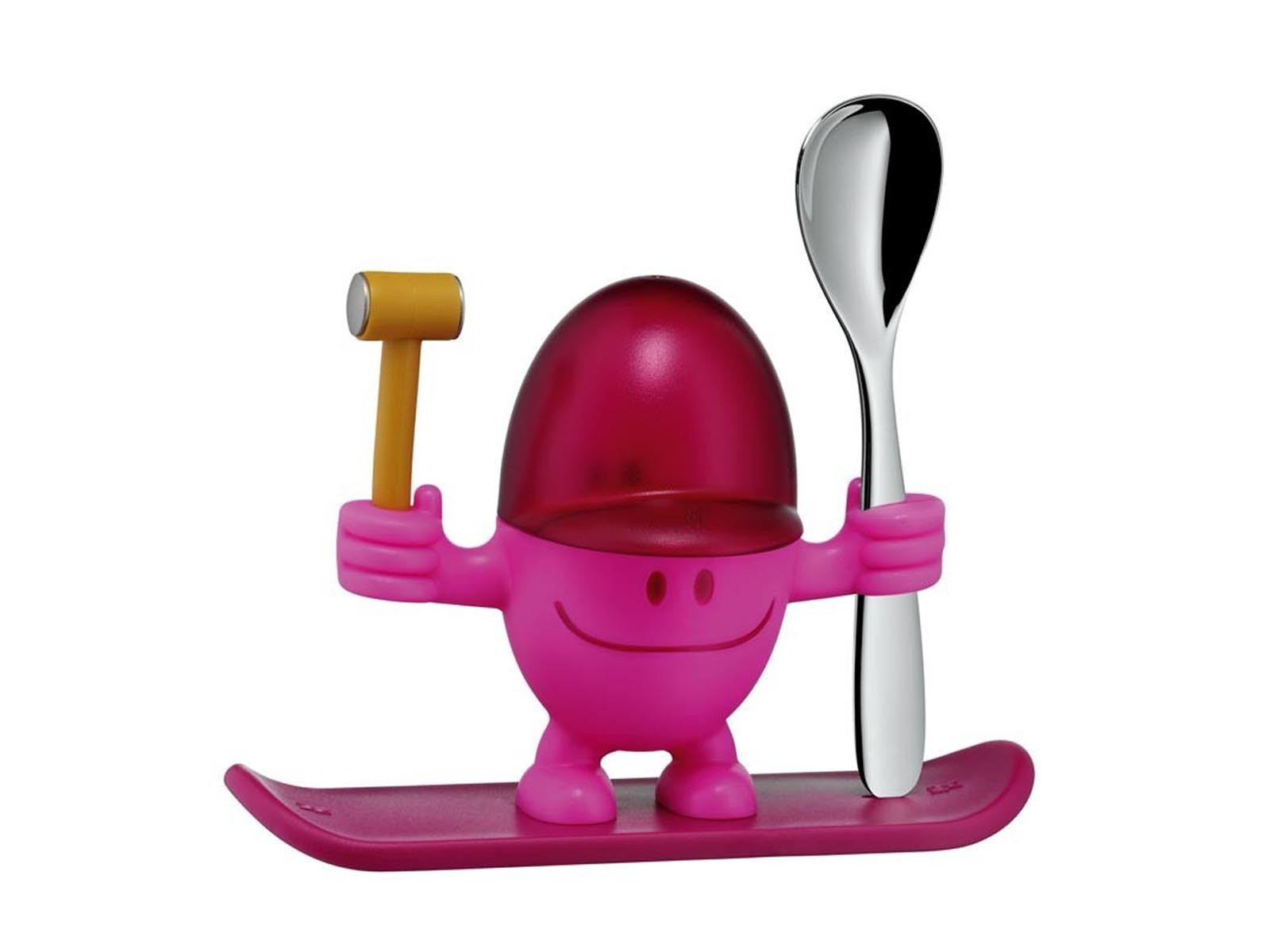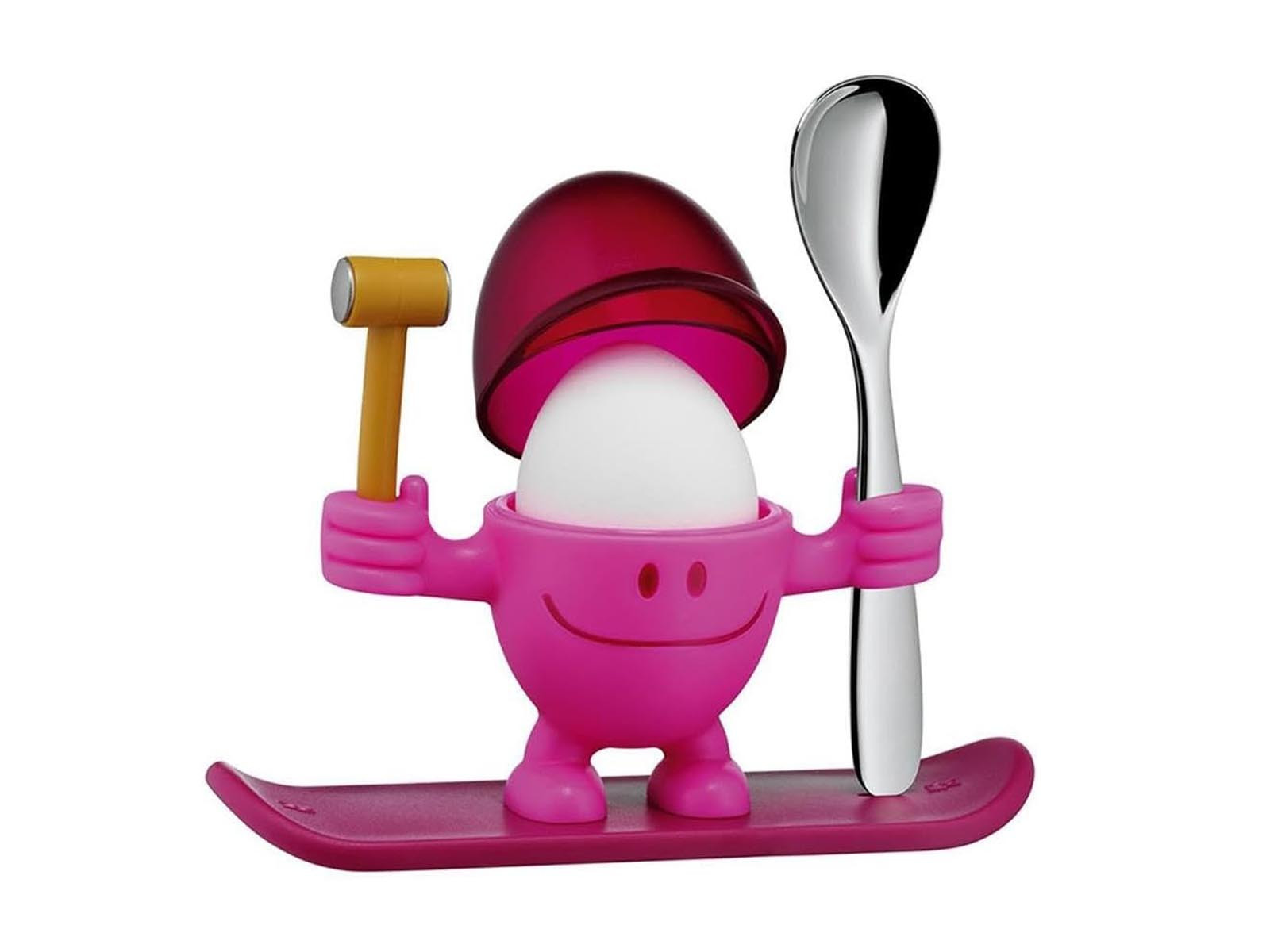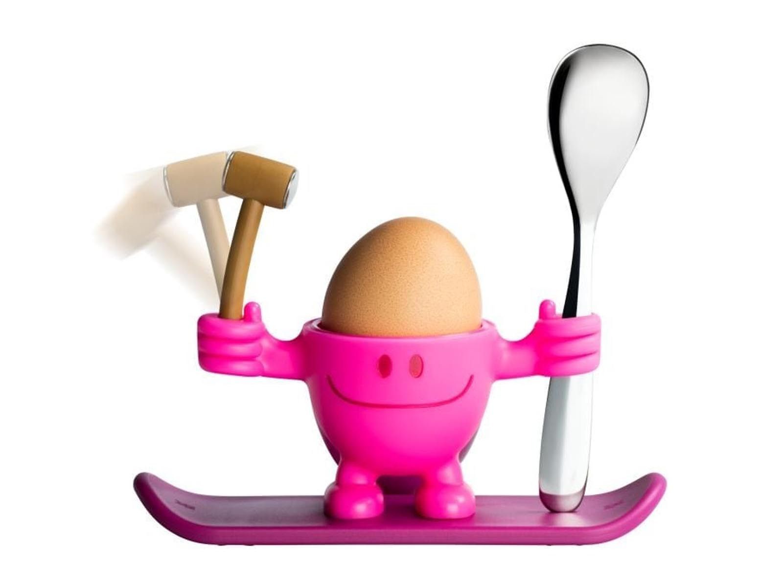 Zabawna ozdobna stołowa podstawka kieliszek do jajek na miękko z łyżeczką i młoteczkiem do rozbijania skorupki.
