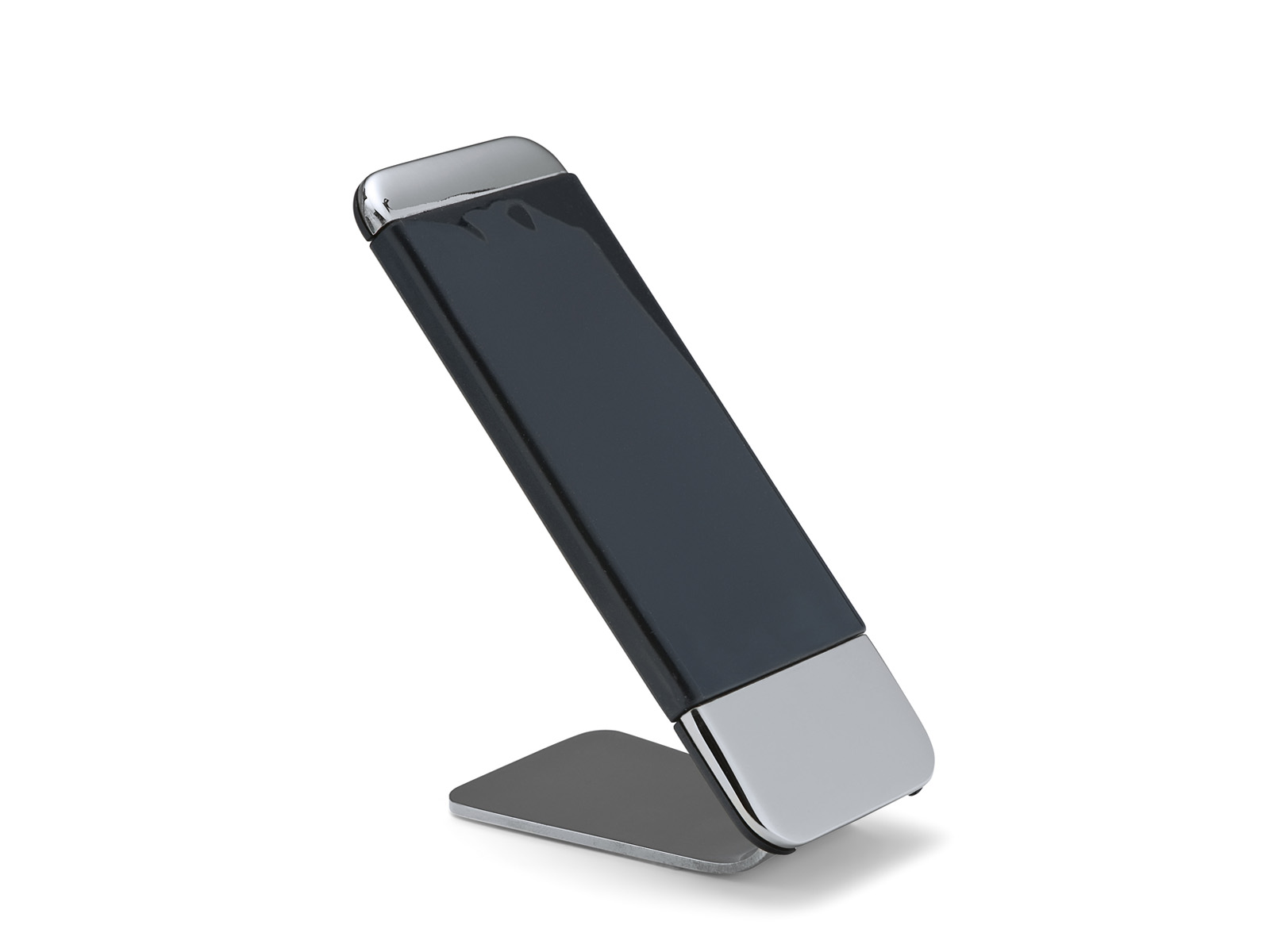 Podstawka o prostokątnym lekko odchylonym pod kątem kształcie przypominającym wygaszony smartfon z wygiętą do tyłu podstawą, wykonana z polerowanego niklu oraz wytrzymałego tworzywa sztucznego ABS.