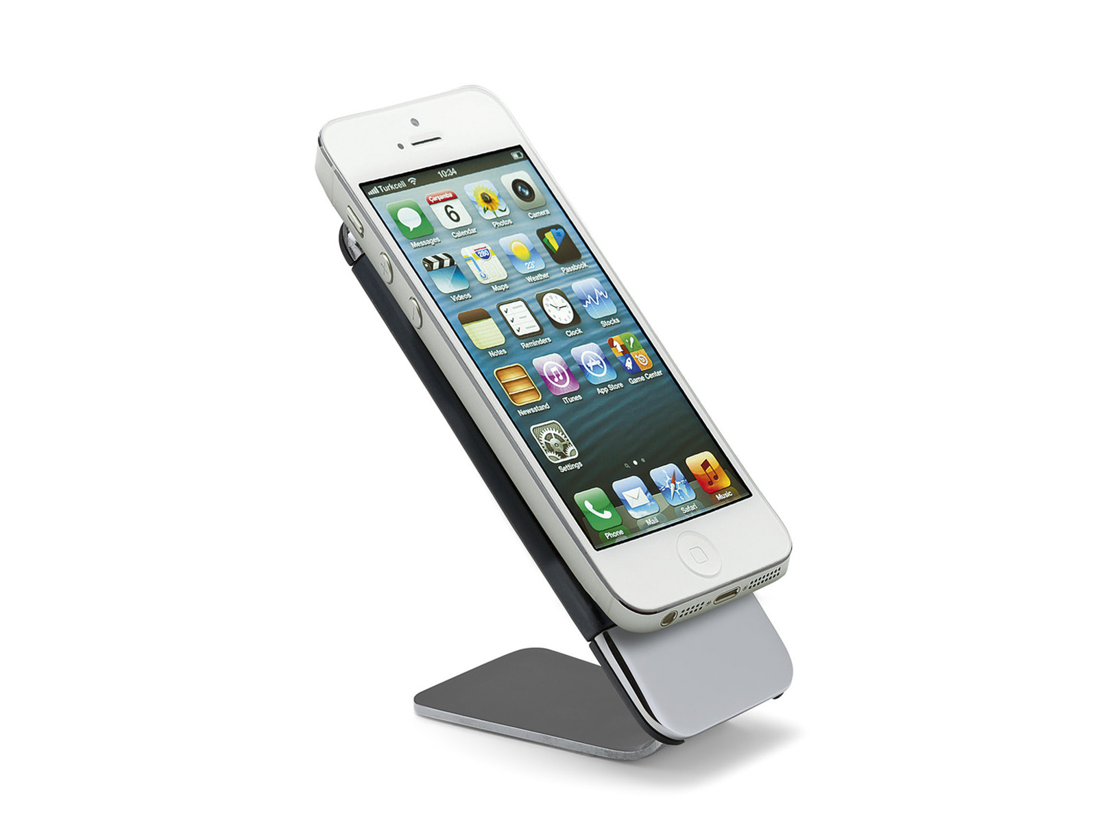 Elegancka nablatowa podstawka na telefon o prostej minimalistycznej konstrukcji z powierzchnią antypoślizgową.