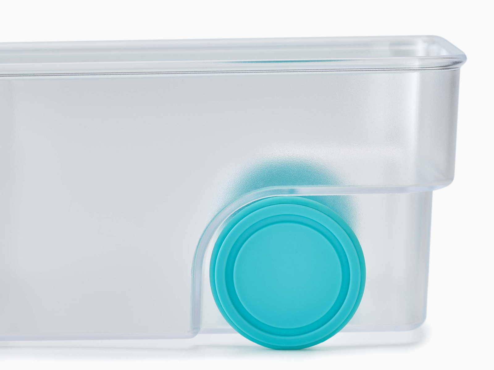 Pojemnik wykonany z tworzywa sztucznego wolnego od BPA w formie rynienki o wysokich półprzezroczystych ściankach na dwóch niewielkich kółeczkach z jednej strony oraz uchwytem w postaci lekko przedłużonego brzegu pojemnika z drugiej.