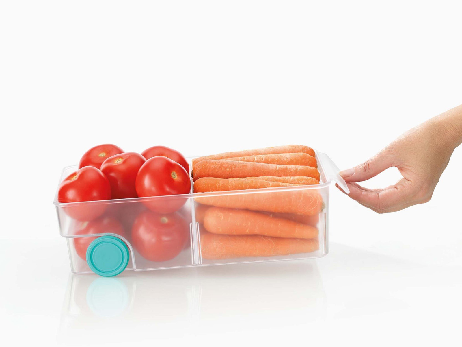 W środku pojemnika znajduje się wyjmowana przegródka, która może podzielić pojemnik na dwie komory.