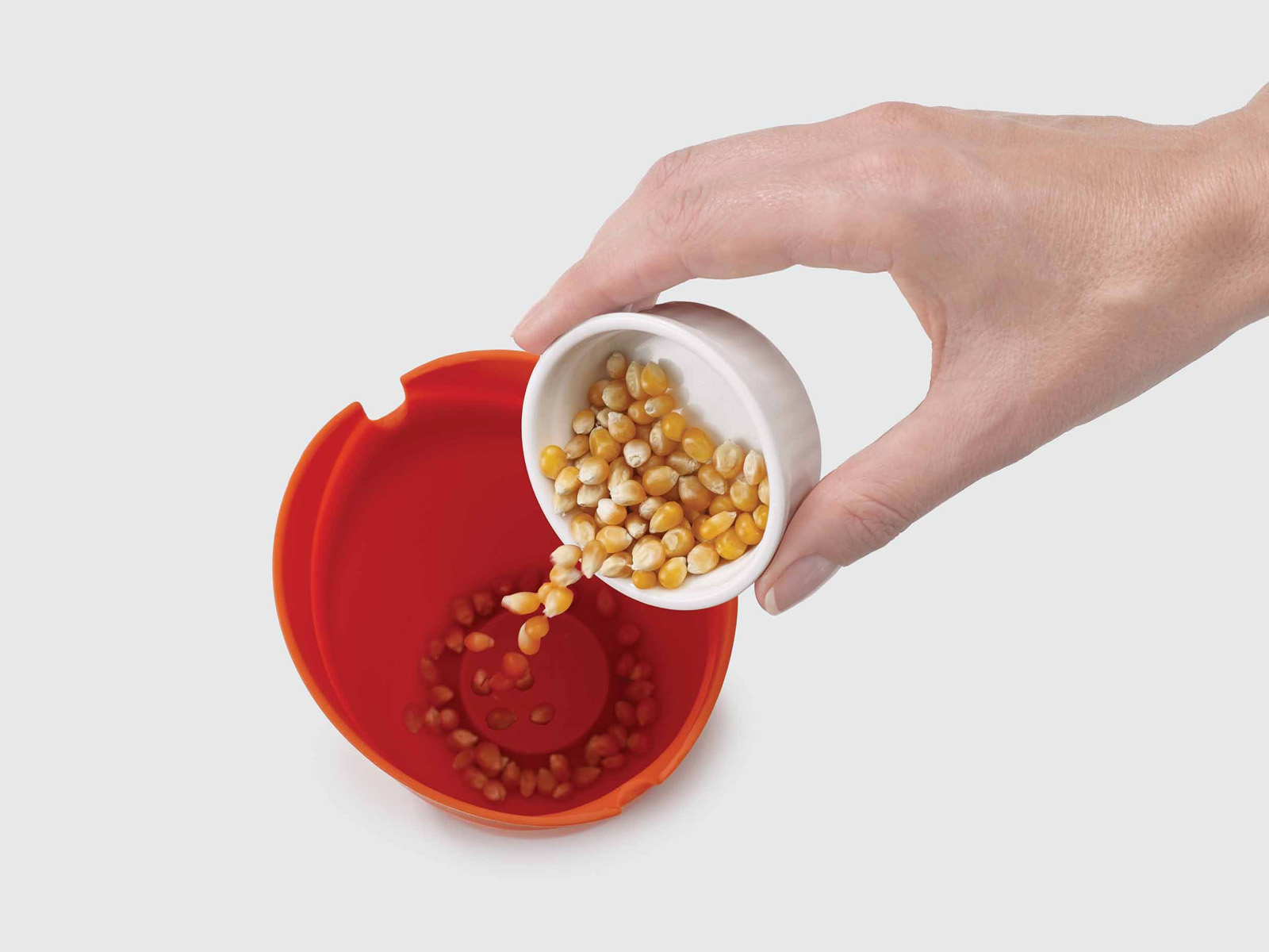 Na dnie pojemników znajduje się zintegrowana miarka ilości ziaren kukurydzy - każdy z pojemników pozwala na przygotowanie pojedynczej porcji (30g) popcornu bez użycia masła lub innego tłuszczu.