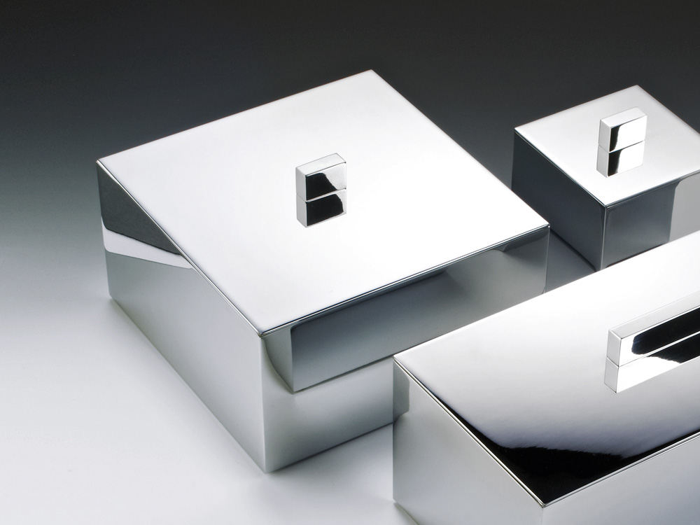 Elegancki duży kwadratowy pojemnik kosmetyczny z wiekiem wykonany z wysokiej jakości chromowanego mosiądzu.