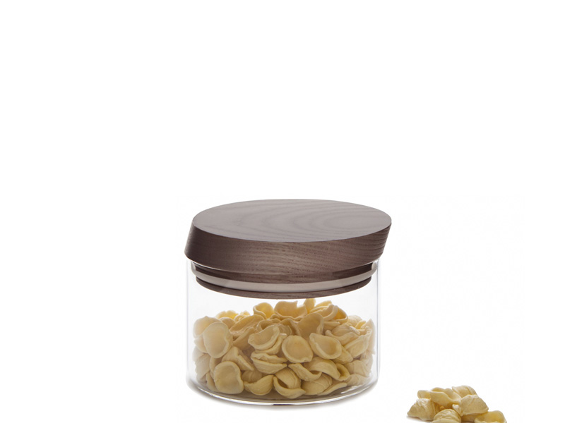 Pojemnik wykonany z przezroczystego dmuchanego szkła, pokrywka uszczelniana wykonana z malowanego drewna jesionowego.