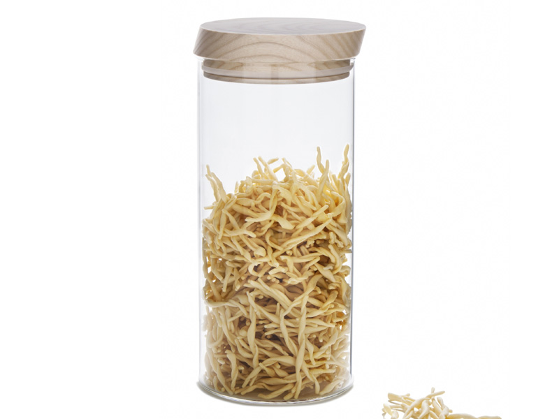 Pojemnik wykonany z przezroczystego dmuchanego szkła, pokrywka uszczelniana wykonana z bielonego drewna jesionowego.