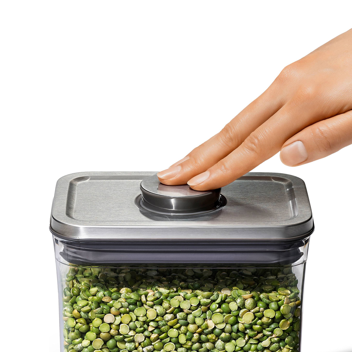 Naciskając przycisk na pokrywie pojemnik uszczelnia się hermetyczne, a po ponownym naciśnięciu przycisku rozszczelnia się umożliwiając zdjęcie pokrywy. Przycisk jest jednocześnie wygodnym uchwytem do zdejmowania pokrywki, dzięki temu do otwierania i zamykania pojemnika wystarczy jedna ręka.