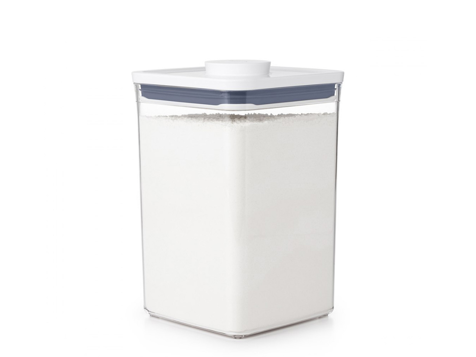 Praktyczny hermetyczny duży pojemnik o kwadratowej podstawie do przechowywania sypkich oraz suchych produktów żywnościowych.