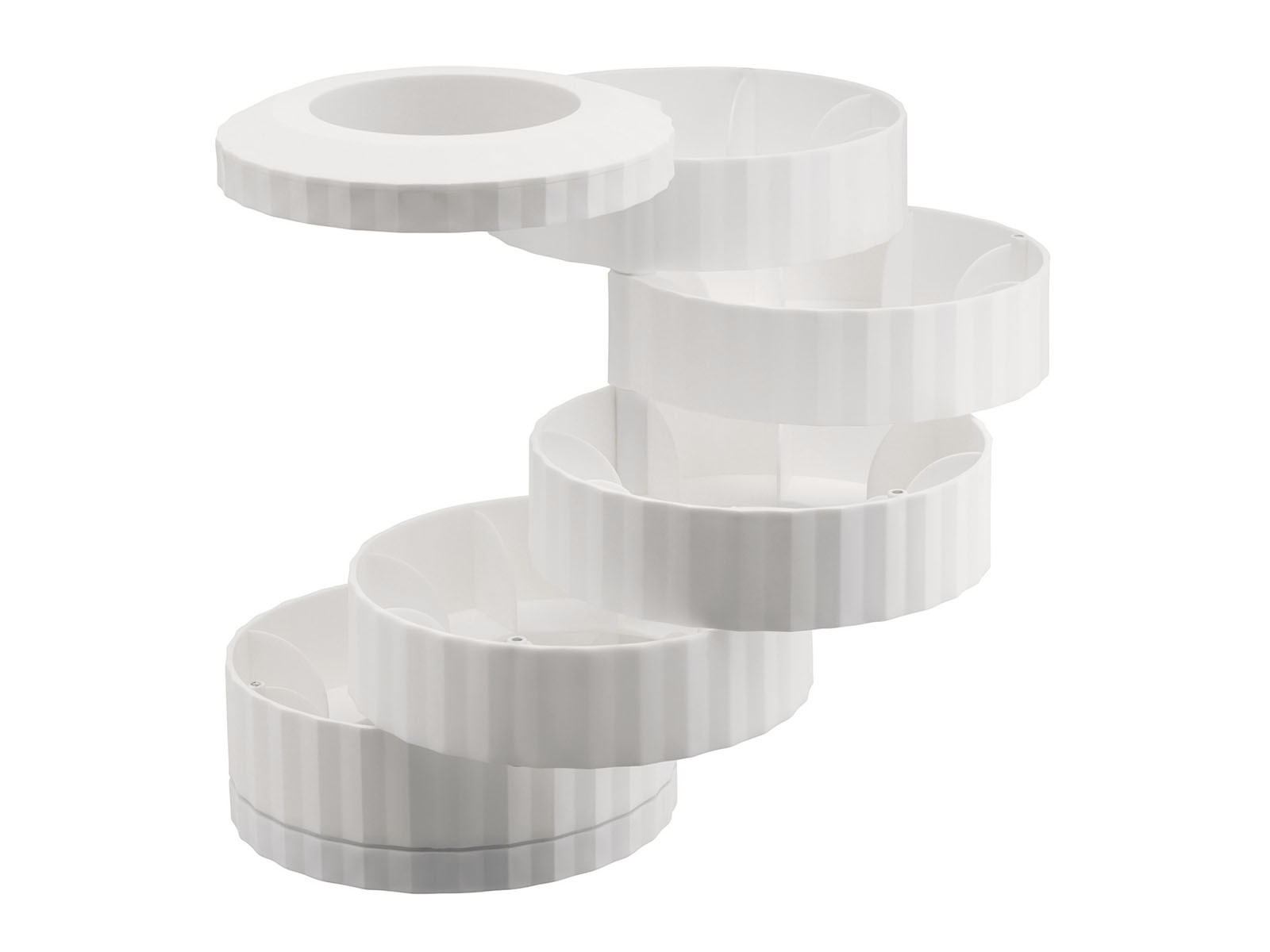 Pojemnik Plisse to oryginalny i bardzo praktyczny pojemnik na kapsułki Naspresso z 5 obrotowymi półkami, które pomieszczą łączni 40 kapsułek. Komory można otworzyć, obracając je wokół osi pionowej. Solidna, ciężka podstawa zapewnia stabilność, nawet gdy wszystkie przegródki są otwarte.