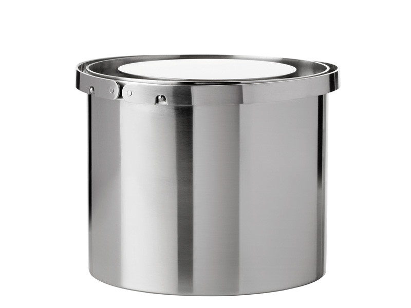 Elegancki niewielki cylindryczny zamykany pojemnik na lód wykonany z wysokiej jakości stali nierdzewnej.