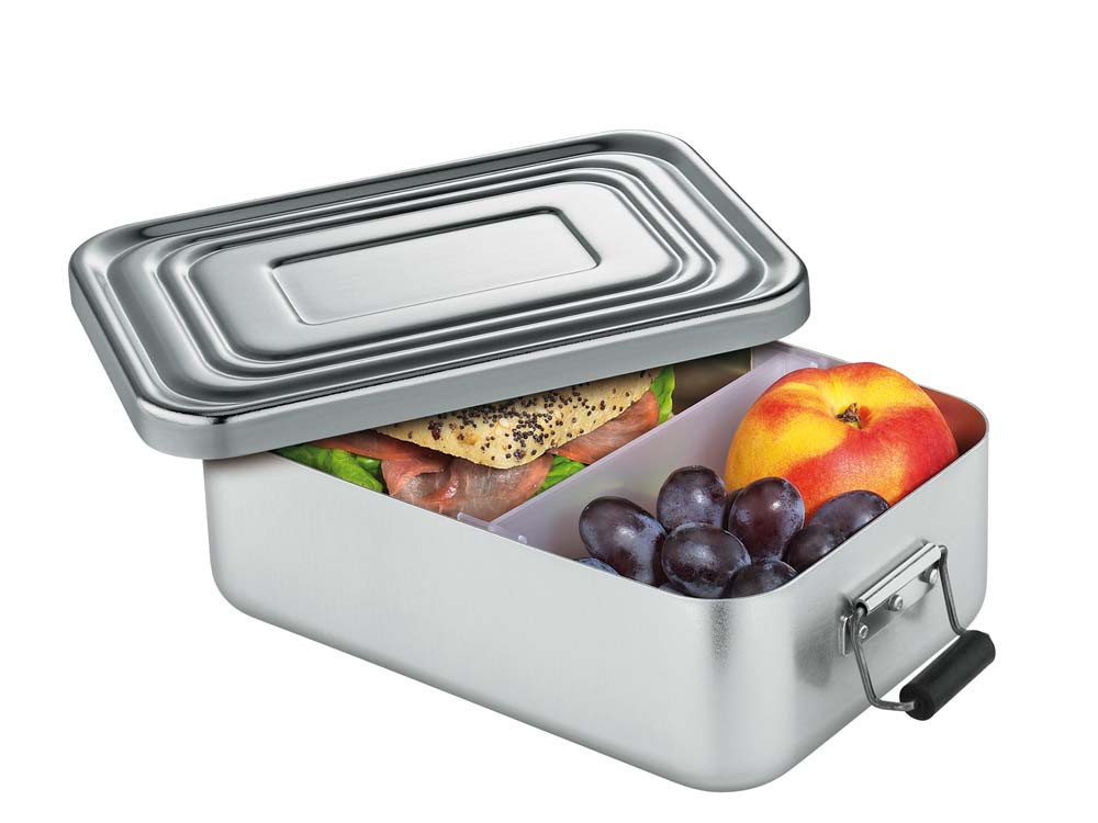Aluminiowe pudełko jest bardzo lekkie, a dzięki wewnętrznej przegródce z tworzywa sztucznego składniki posiłku nie mają bezpośredniego kontaktu i nie mieszają się ze sobą.
