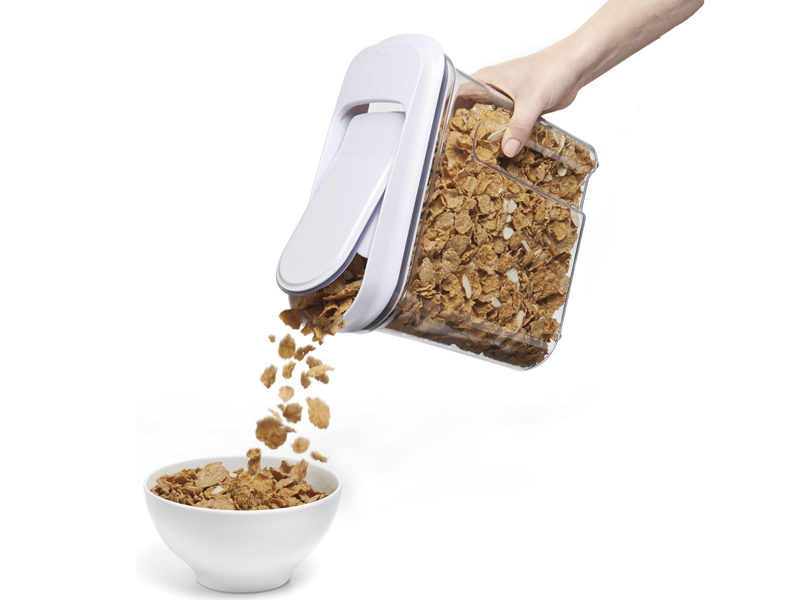 Pojemnik na płatki śniadaniowe OXO posiada praktyczny mechanizm pozwalający nam na otwieranie i zamykanie za pomocą jednej ręki. Otwór do porcjowania został zaprojektowany tak aby zapobiegać przypadkowemu rozsypywaniu zawartości, a za sprawą uszczelki wykonanej z silikonu nasza żywność pozostaje dłużej świeża. Dzięki funkcjonalnemu kształtowi całość prezentuje się na półkach bardzo efektownie. Pudełko nadaje się do przechowywania nie tylko płatków śniadaniowych, ale również przekąsek, mąki, ryżu, kaszy, cukru lub słodyczy. Pojemnik wykonany z tworzywa sztucznego, wolnego od BPA. .