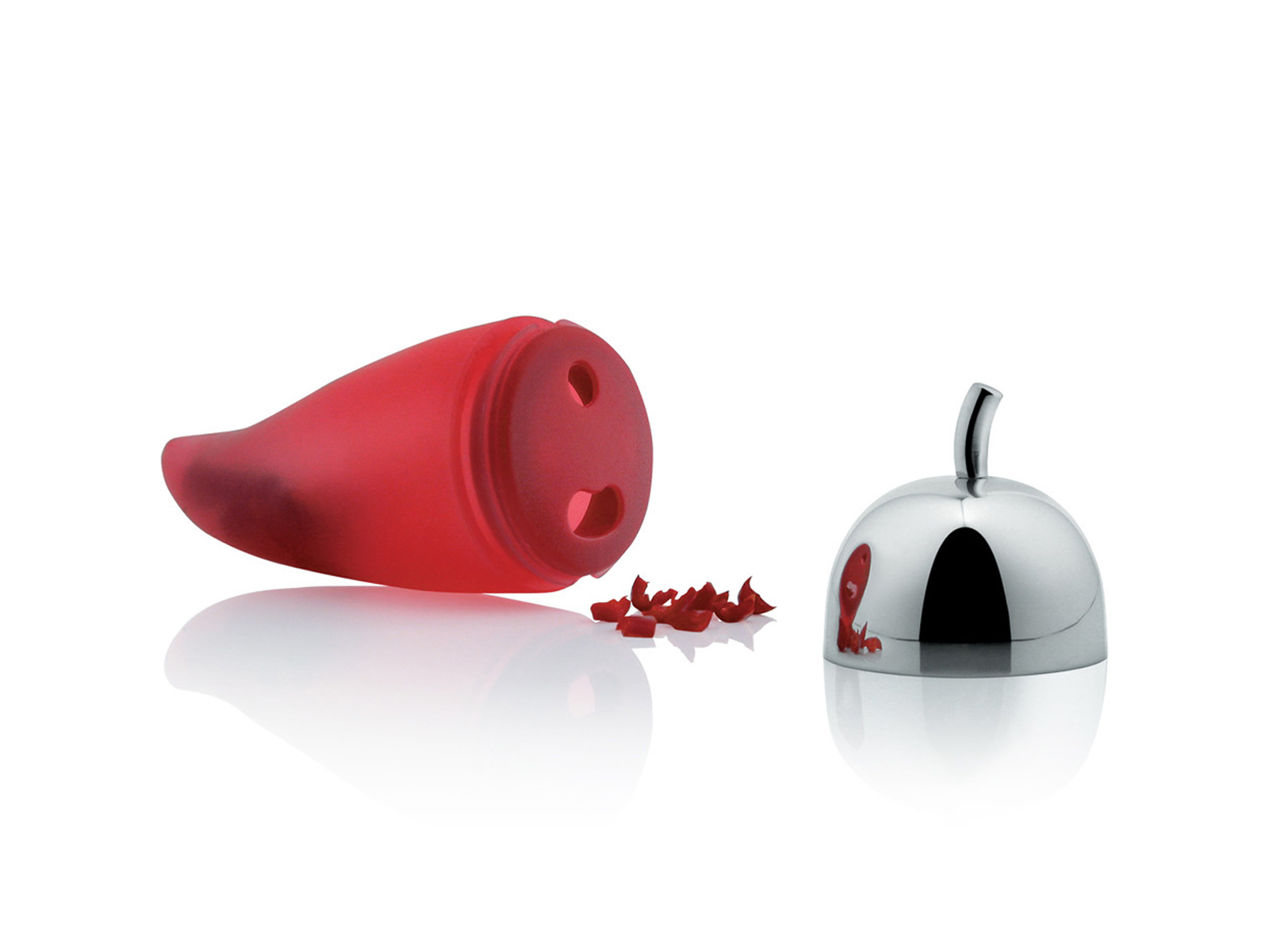 Sama forma pojemnika doskonale oddaje jego przeznaczenie. Akcesorium wykonane z czerwonej gumy silikonowej swoim podłużnym, lekko zakrzywionym kształtem przypomina paprykę. Pokrywka ze stali nierdzewnej 18/10, polerowana na wysoki połysk, zakończona jest krótkim uchwytem o wyglądzie gałązki, co uzupełnia cały design.
