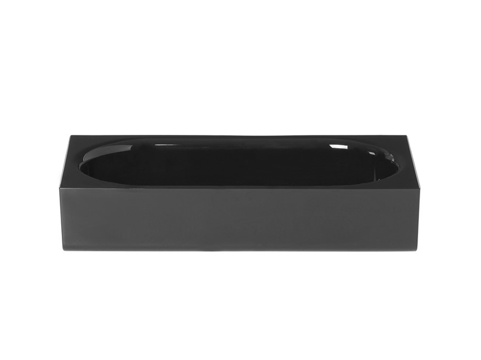 Pojemnik łazienkowy posiada owalne wgłębienie do przechowywania kosmetyków, biżuterii czy przyborów toaletowych. Wykonany jest z czarnego szkła akrylowego, a jego design idealnie komponuje się z czarnymi półkami z tej samej kolekcji.