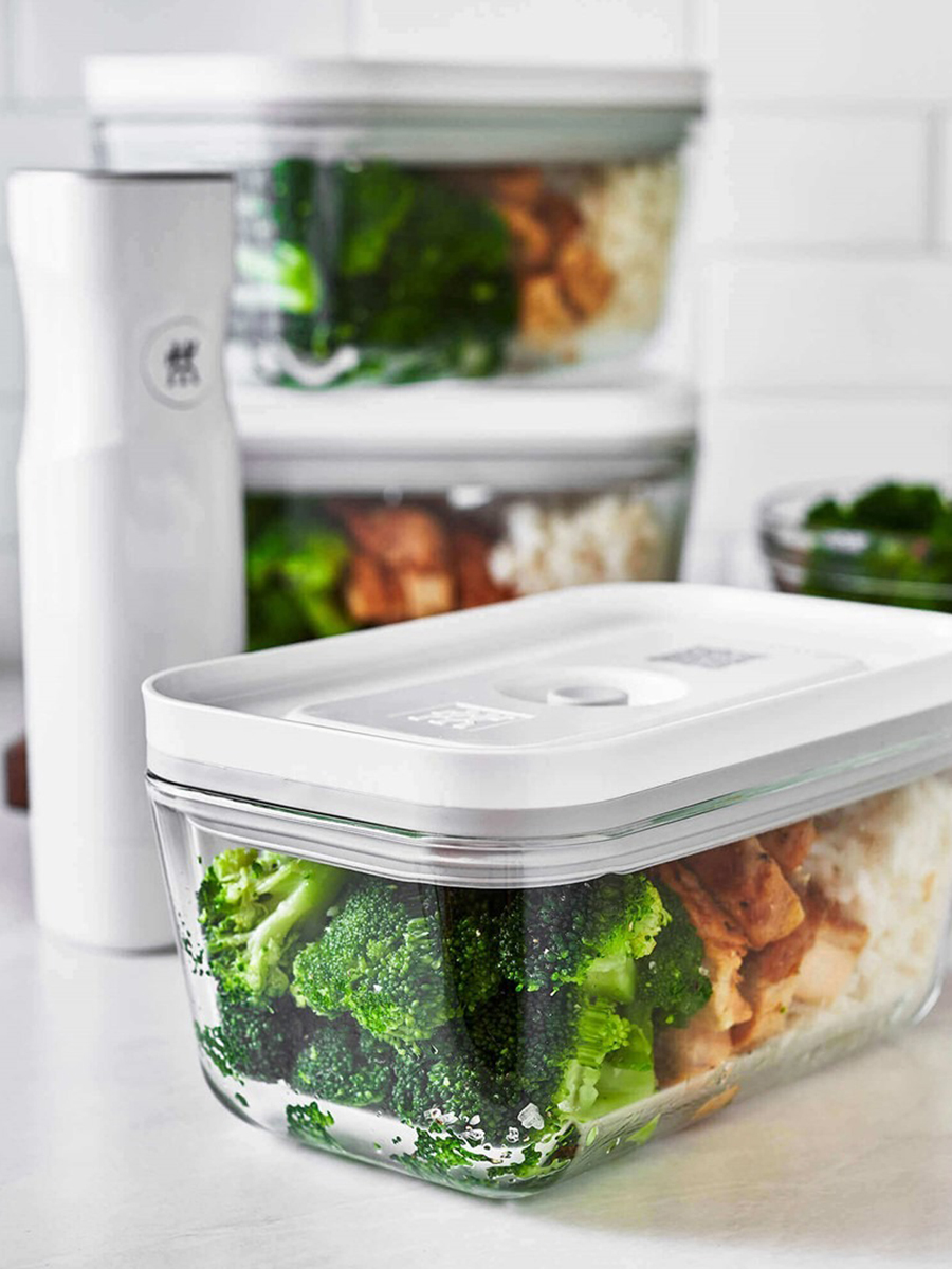 Kolekcja Zwilling Fresh & Save Gray to eleganckie połączenie praktyczności i innowacji, które zmienia sposób przechowywania świeżych produktów oraz gotowych potraw. Pojemniki próżniowe wykonane ze szkła borokrzemowego wolnego od BPA, są przystosowane do używania w zamrażarce, piekarniku do 180°C, kuchence mikrofalowej i zmywarce, co czyni je wyjątkowo uniwersalnymi. Dzięki systemowi próżniowemu jedzenie pozostaje świeższe nawet pięciokrotnie dłużej, z zachowaniem oryginalnego smaku i wartości odżywczych. Każdy pojemnik posiada innowacyjny zawór, który sprawia, że pompa próżniowa błyskawicznie usuwa z wnętrza powietrze. Każdy pojemnik można też połączyć za pomocą kodu QR, z darmową aplikacją Zwilling Culinary World, która przypomina o terminie przydatności i ułatwia organizację posiłków. Dostępne rozmiary S, M i L pozwalają na dużą swobodę w pakowaniu zarówno małych przekąsek, jak i większych dań, gwarantując wygodę w każdym domu.