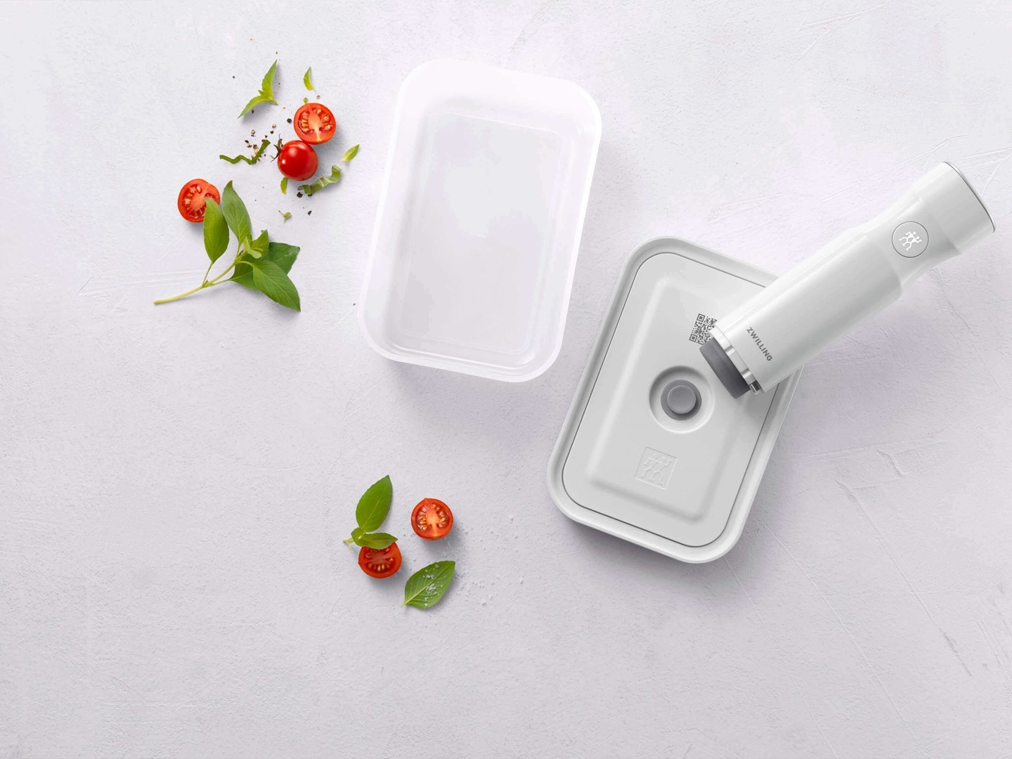 Kolekcja Zwilling Fresh & Save Gray to eleganckie połączenie praktyczności i innowacji, które zmienia sposób przechowywania świeżych produktów oraz gotowych potraw. Pojemniki próżniowe wykonane z plastiku wolnego od BPA, są przystosowane do używania w lodówce, kuchence mikrofalowej i zmywarce, co czyni je uniwersalnymi. Dzięki systemowi próżniowemu jedzenie pozostaje świeższe nawet pięciokrotnie dłużej, z zachowaniem oryginalnego smaku i wartości odżywczych. Każdy pojemnik posiada innowacyjny zawór, który sprawia, że pompa próżniowa błyskawicznie usuwa z wnętrza powietrze. Każdy pojemnik można też połączyć za pomocą kodu QR, z darmową aplikacją Zwilling Culinary World, która przypomina o terminie przydatności i ułatwia organizację posiłków. Dostępne rozmiary S, M i L pozwalają na dużą swobodę w pakowaniu zarówno małych przekąsek, jak i większych dań, gwarantując wygodę w każdym domu.