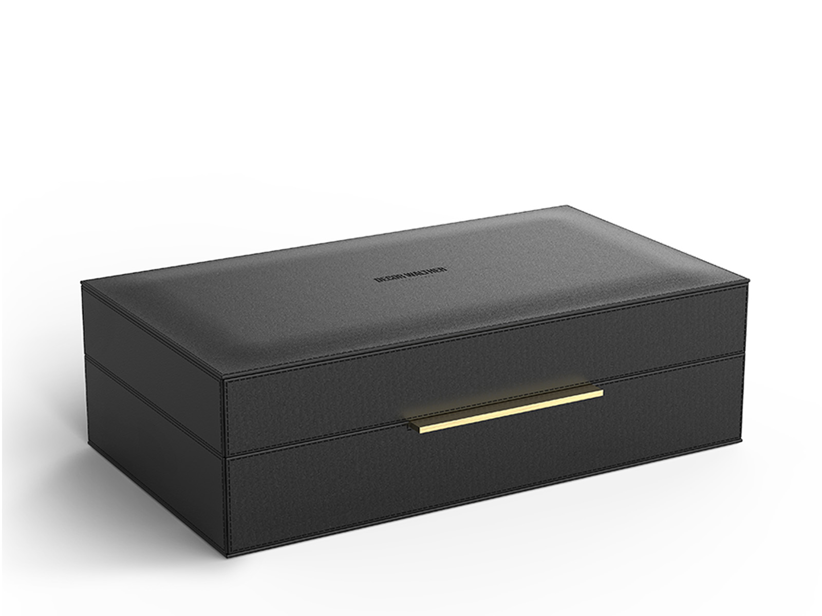 Pudełko posiada prostokątny minimalistyczny chwyt z matowego nielakierowanego mosiądzu pięknie podkreślający proste geometryczne kształty pudełka.