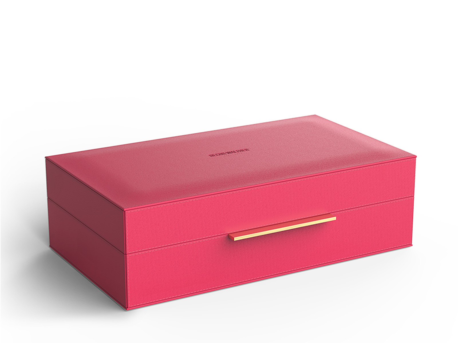 Pudełko posiada prostokątny minimalistyczny chwyt z matowego nielakierowanego mosiądzu pięknie podkreślający proste geometryczne kształty pudełka.
