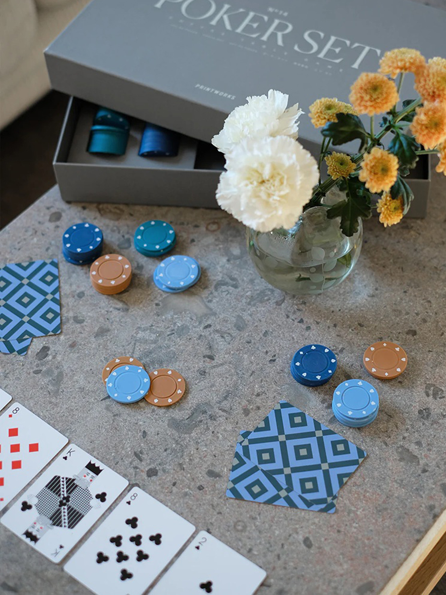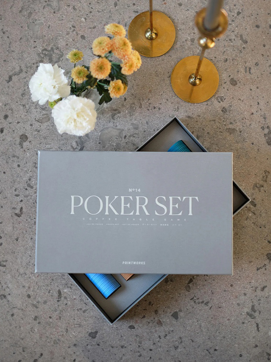 Poker Set jest częścią kolekcji gier Classic, wyróżniającej się harmonijną typografią o odpowiednio dobranej, stonowanej palecie barw. Poza godzinami świetnej rozrywki w rodzinnym gronie zaoferuje też inspirację artystyczną formą, która stanie się ozdobą na kominkach, regałach, kredensach i stolikach kawowych. Podobnie jak inne gry Printworks, dzięki wysokim walorom estetycznym jest kreatywnym pomysłem na angażujący, a jednocześnie pięknie zdobiony prezent na każdą okazję. Opakowanie każdego zestawu przykuwa wzrok, zapada głęboko w pamięć i przechowuje elementy do zabawy, która budzi szczególny sentyment. Dodatkowo, doskonale prezentuje się we wszystkich wnętrzach.