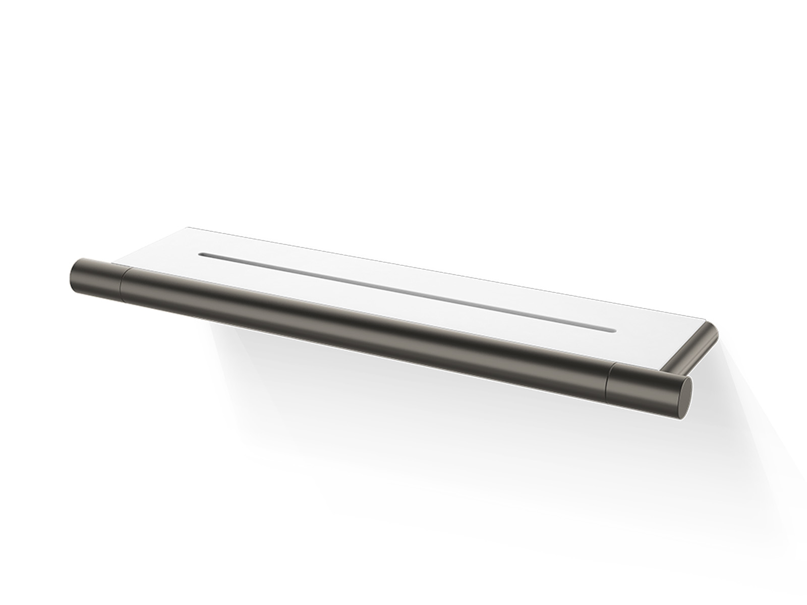 Półka długa prostokątna wykonana z białego kompozytu mineralnego w wykończeniu matowym - po środku półki znajduje się długa szczelina odpływowa do odprowadzania wody.