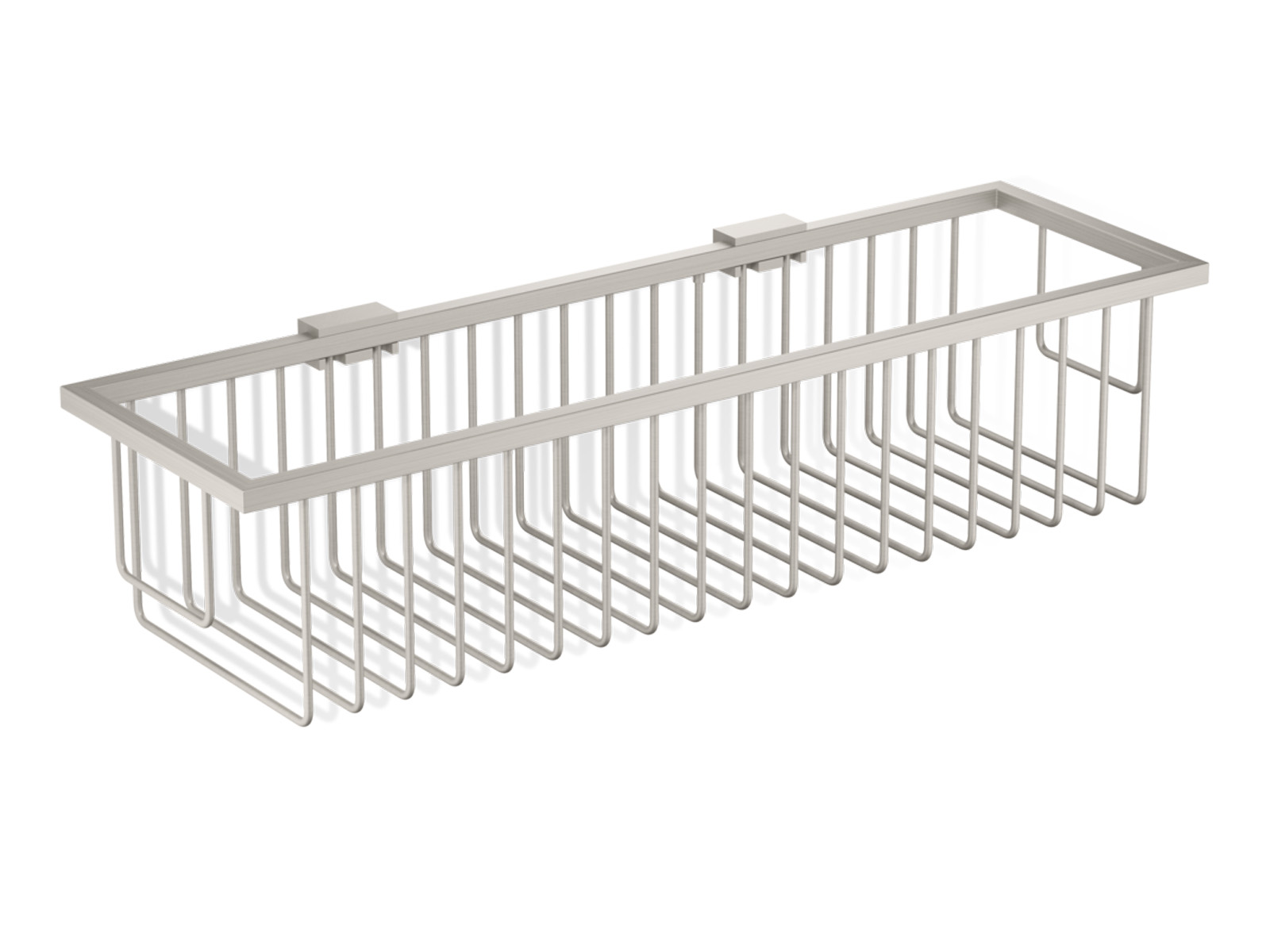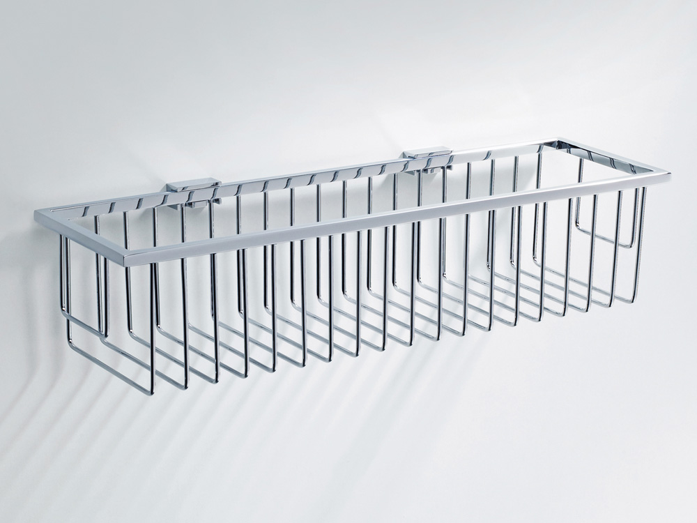 Elegancki ścienny organizer półka pod prysznic w postaci długiego ażurowego koszyczka na kosmetyki i przybory kąpielowe.