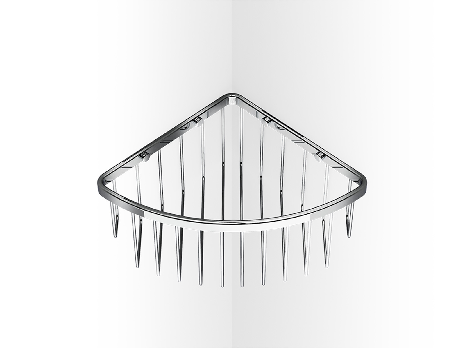 Elegancki ścienny narożny organizer półka pod prysznic w postaci ażurowego koszyczka na kosmetyki i przybory kąpielowe o lekko zaokrąglonej przedniej ściance.
