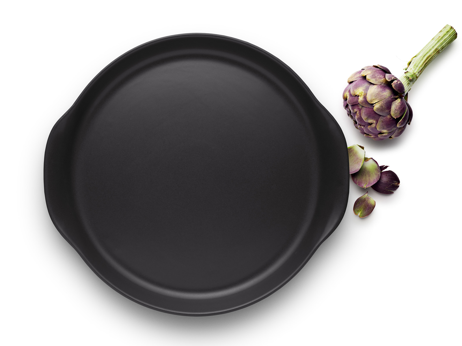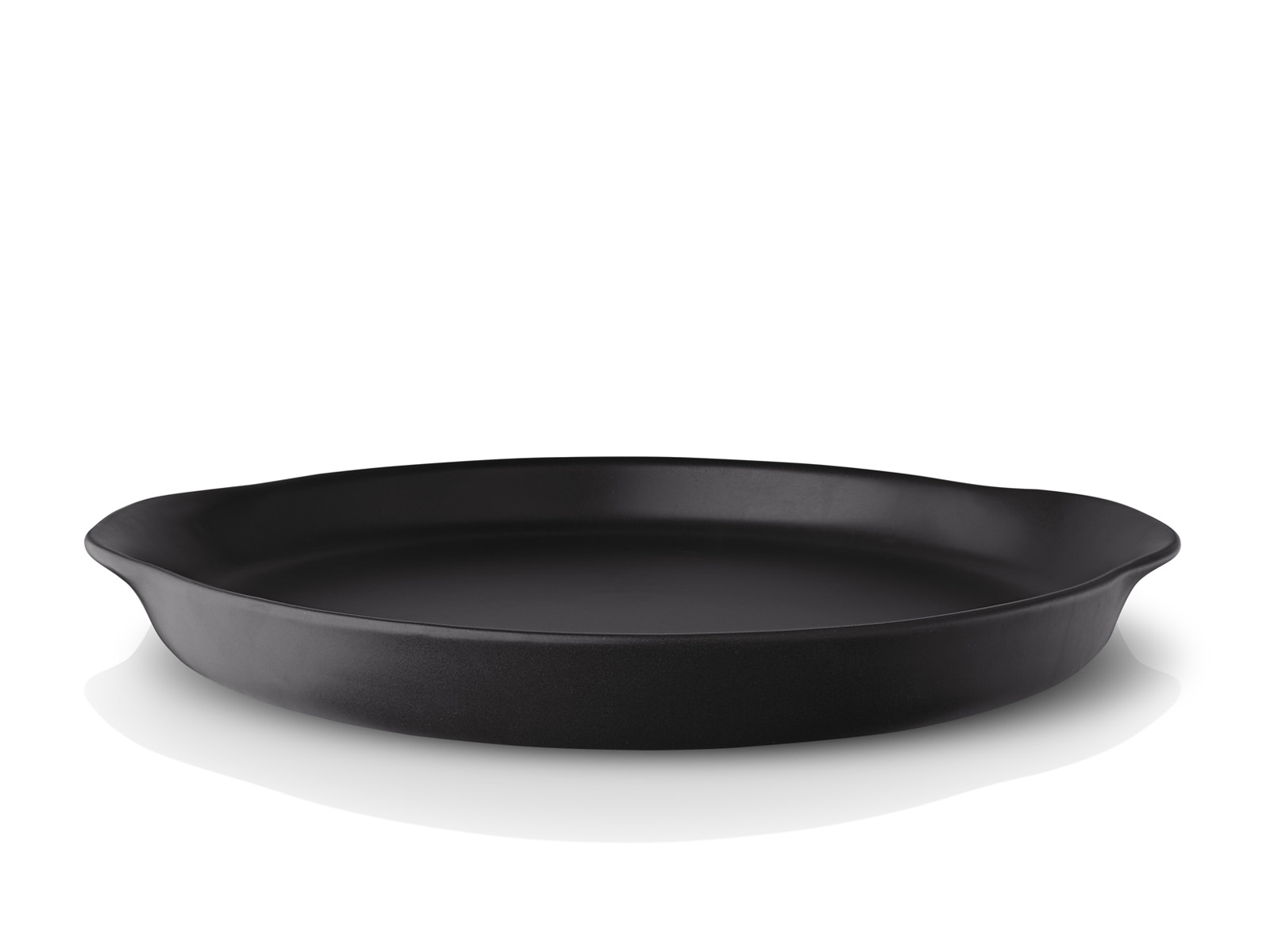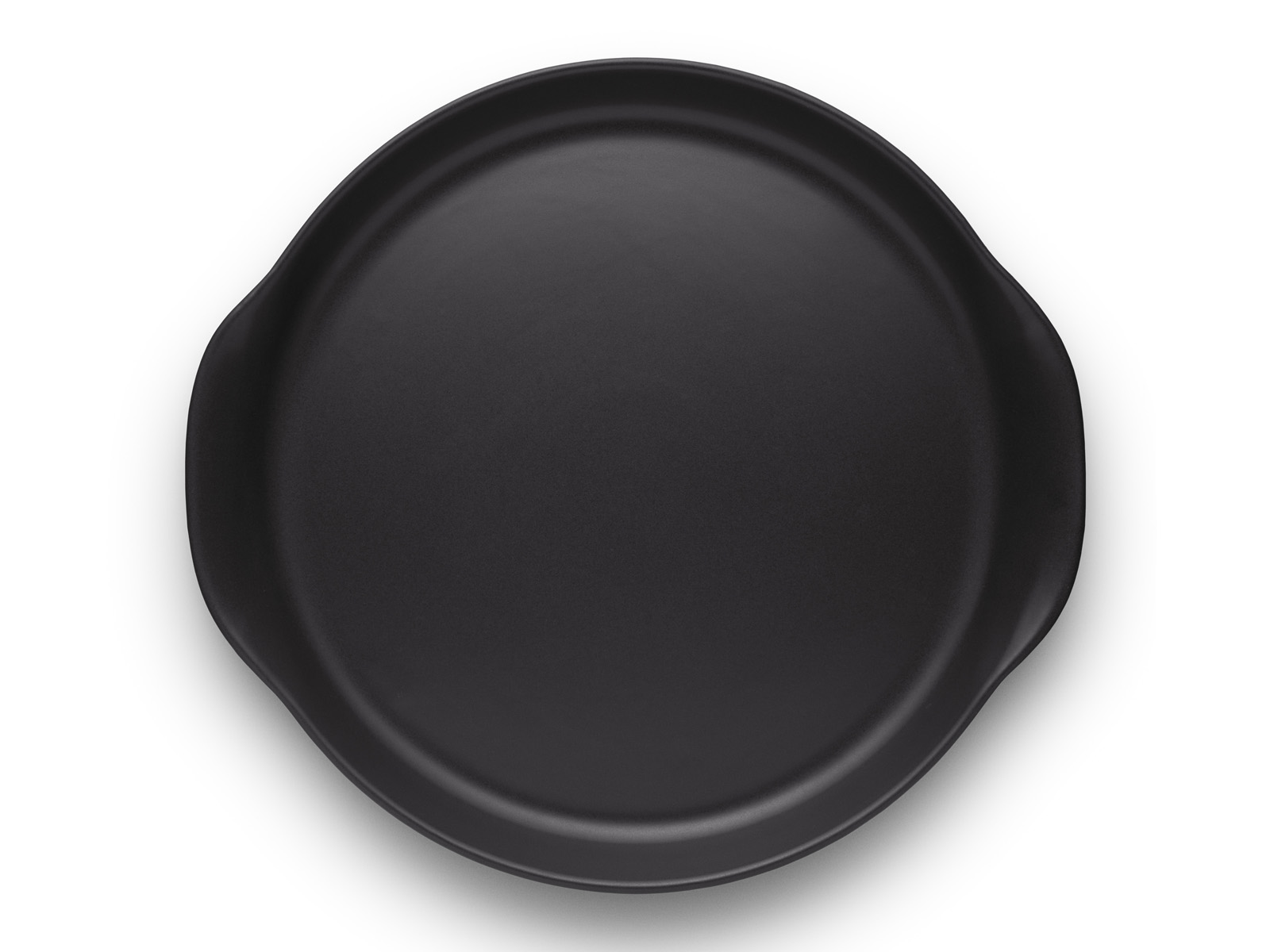 Duży płaski i gładki półmisek z wąskim brzegiem z dwoma uformowanymi z niego uchwytami, wykonany z kamionki cechującej się wysoką odpornością na uszkodzenia mechaniczne oraz działanie kwasów i wody.