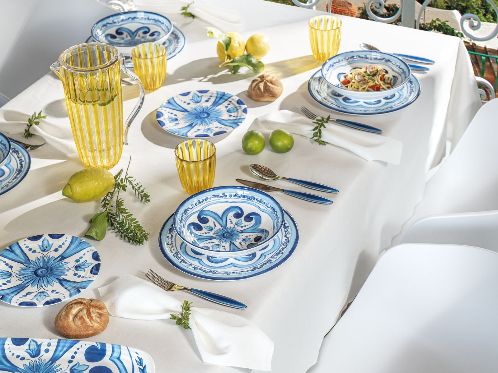 Guzzini Blues to bardzo oryginalna i pełna pozytywnej energii kolekcja naczyń i akcesoriów do jadalni. Kolekcja zdecydowanie utrzymana jest w południowym, śródziemnomorskim klimacie. Przywołuje charakterystyczne dla śródziemnomorskiej tradycji wzory, kształty i kolory, będąc jasnym, świeżym dodatkiem na każdym stole. Kolekcja idealna na posiłek, spotkanie lub imprezę na świeżym powietrzu, nieformalny brunch lub specjalną okazję.