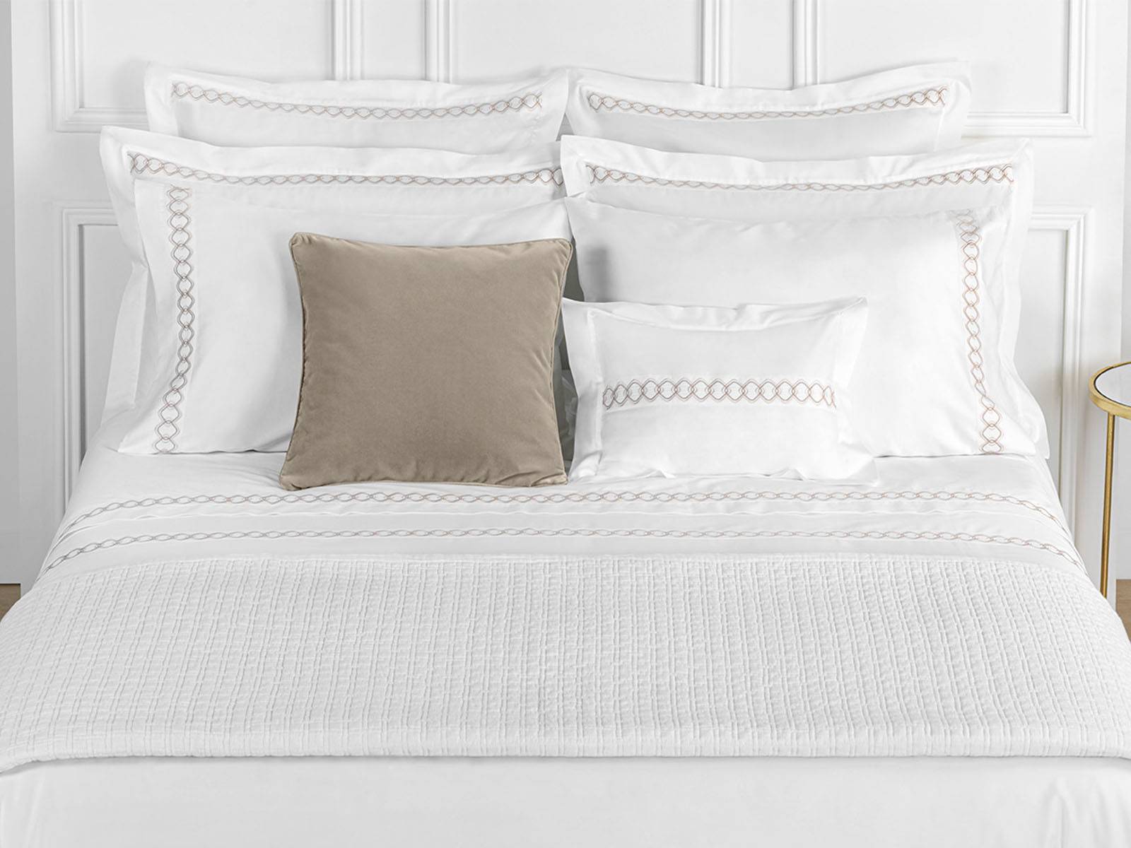 Model Amalia Ornato to unikatowe połączenie najlepszego gatunku bawełny egipskiej Giza 94 w gęstym splocie satynowym 430TC z eleganckim wzorem w postaci kolorowej ramki wokół każdego z elementów pościeli